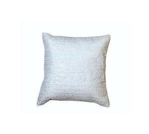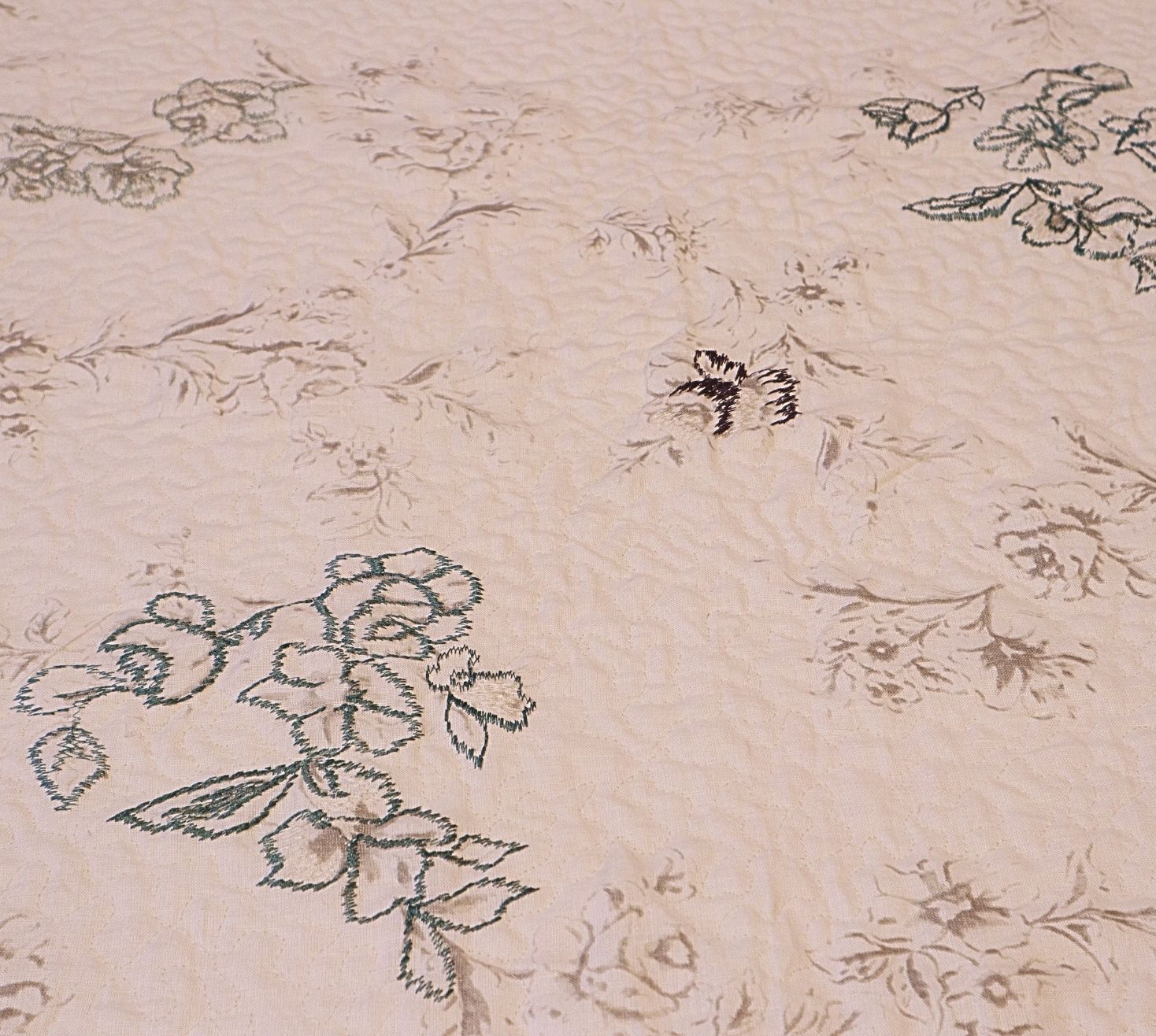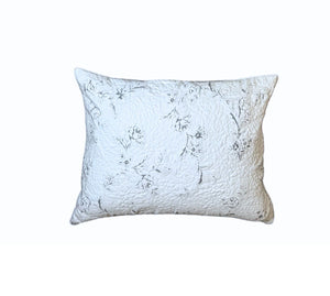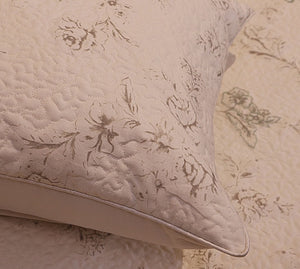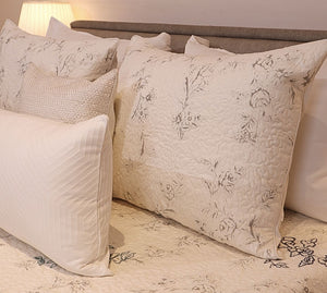 Discover the pure elegance of this floral 5-piece bedding set, where the timeless beauty of pristine white meets the delicate allure of blossoms in bloom. The king-sized quilted bed cover is hand-crafted with shades of grey, white, and blue sparsely spread on the quilt. It comes with a set of two shams, a white silk jacquard cushion, and a self-jacquard rectangular cushion in the center. Immerse yourself in the crisp, clean comfort of white linen fabric while enjoying the subtle charm of intricate floral patterns.