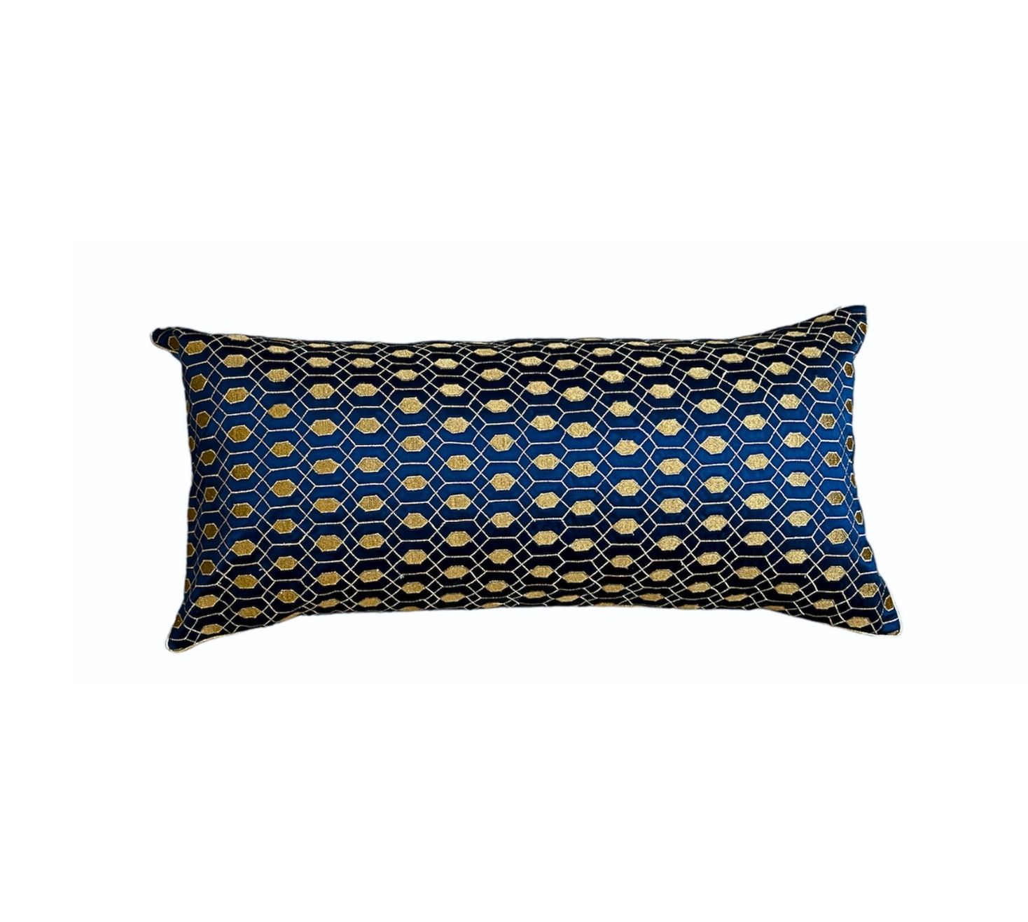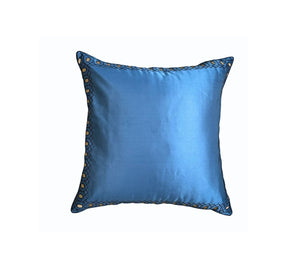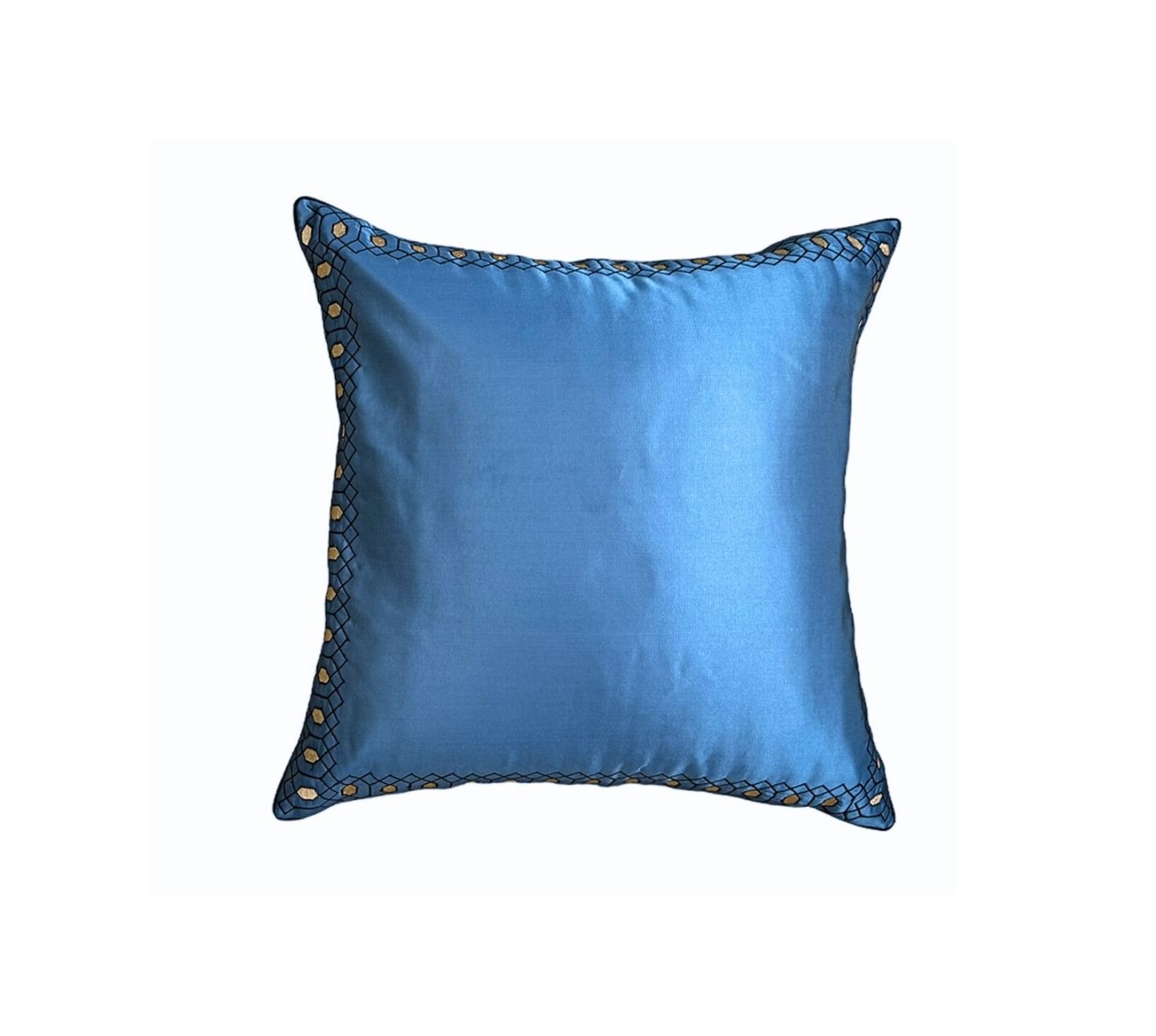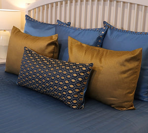 The cushions are embroidered on all four sides in contrasting blues and gold reshams and accompanied by contrasting golden rectangular cushions and a heavily embroidered cushion in the center. This set includes a quilted bed cover, two pillows and four cushions.