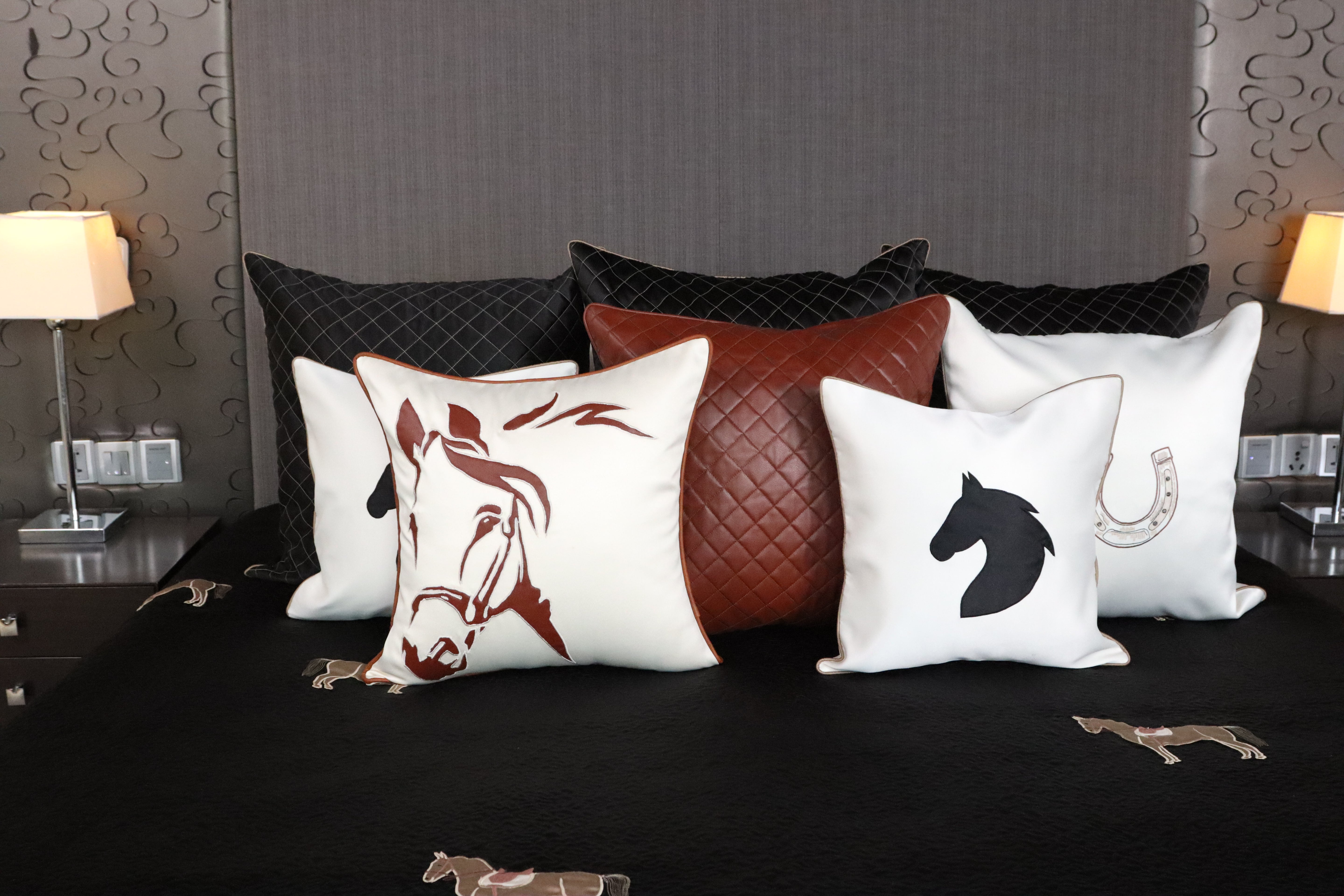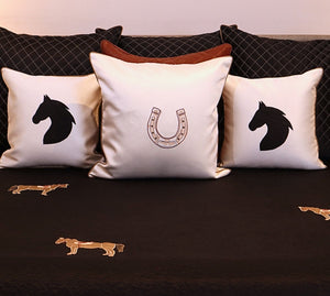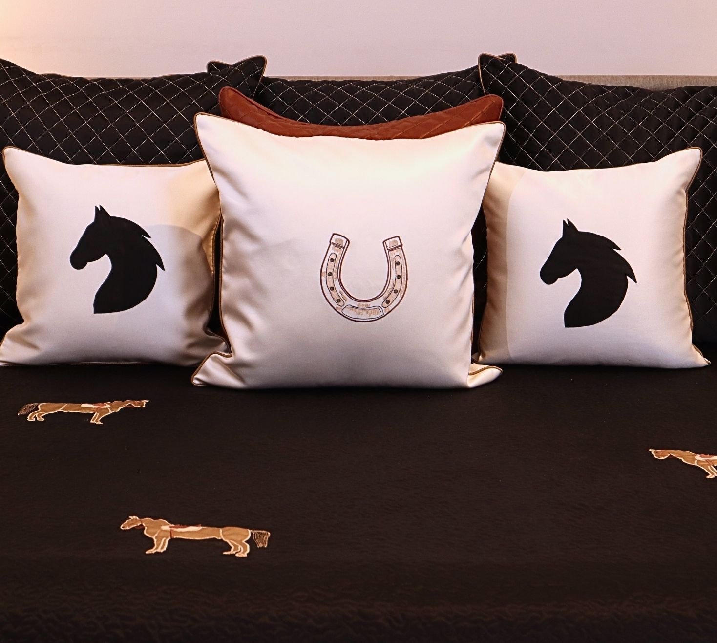 Immerse yourself in the allure of this 8-piece Stallion bedding set. Crafted with care, it captures the spirit of a majestic stallion, combining bold designs with luxurious comfort. The king-sized bed cover is created with equine-inspired opulence, with horses patchworked and embroidered on the entire bed cover. Showcasing the power and grace of these magnificent creatures, the cushions and shams bear the same inspiration and are intricately embellished. This set includes a bed cover, three pillows and four cushions.