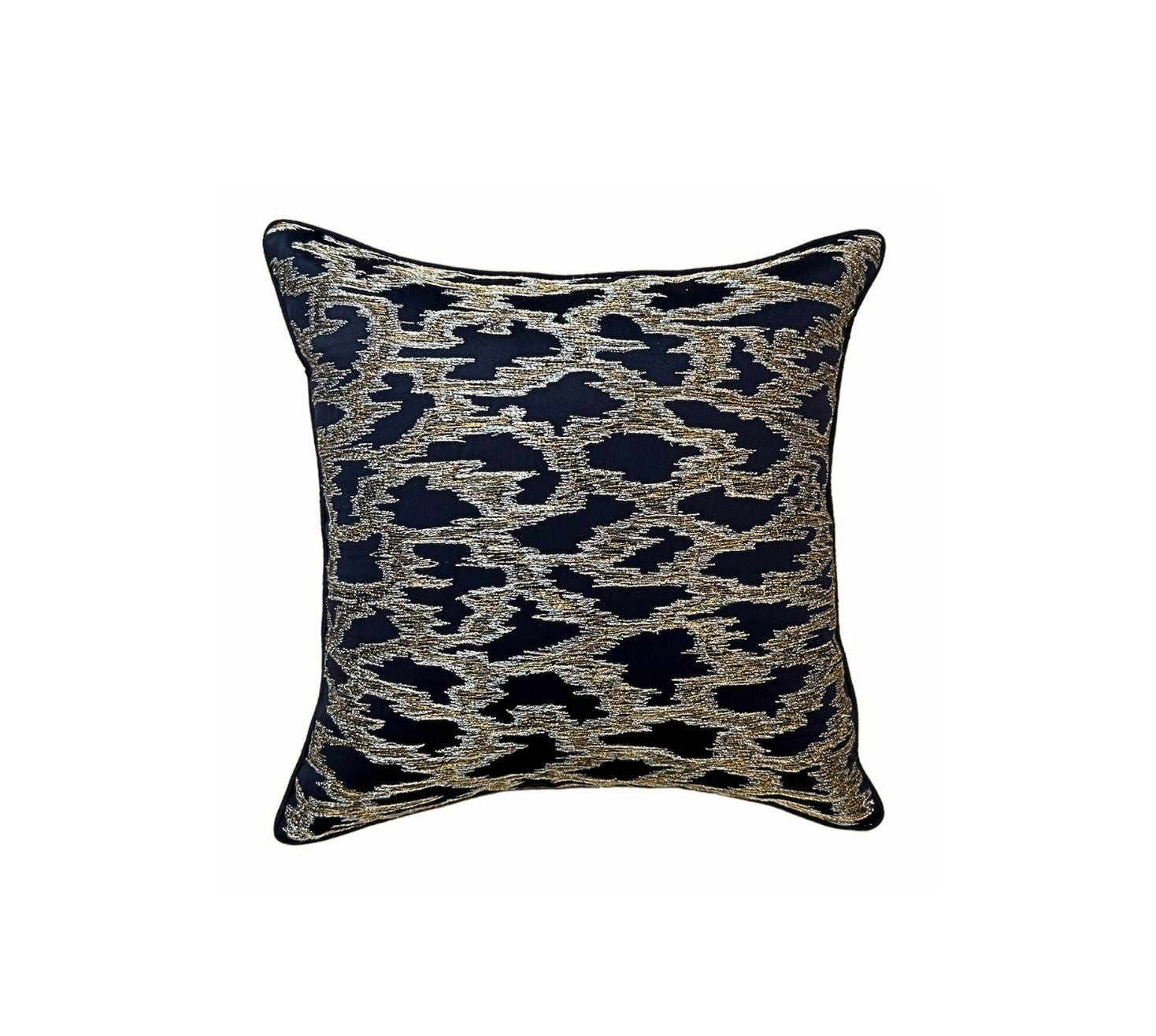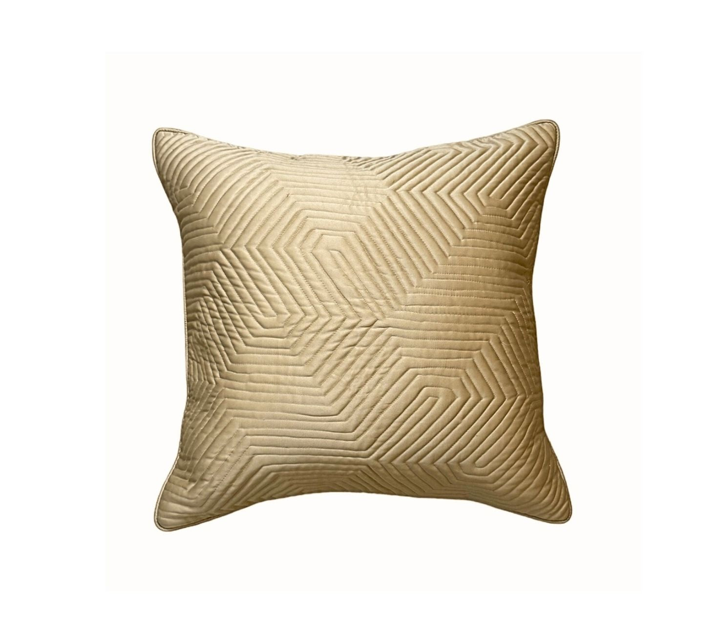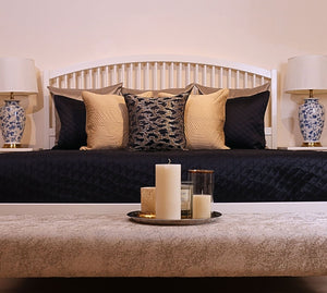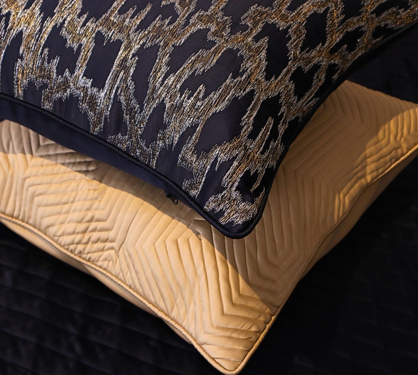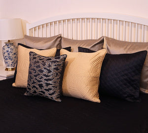 Experience luxury with this 9-piece bedding set, featuring meticulously quilted textures and soothing tones. The king-sized bed cover transforms your bedroom into a classy setting. Three square jacquard cushions in bluish gold and a combination of quilted ink-colored shams are heightened with a geometric pattern in gold. The center cushion is ornamented with zari embroidery. With a contemporary look that would accentuate any colored wood, this bed cover will glorify your corner. This set includes a bed cover, two pillows and six cushions.