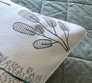 The darker green cotton cushions introduce depth and contrast, while the 20” x 20” embroidered cushion on crisp white cotton adds a delicate touch of craftsmanship. To complete the arrangement, a wool jacquard accent cushion brings in texture and warmth, tying together the entire setting with effortless elegance.
