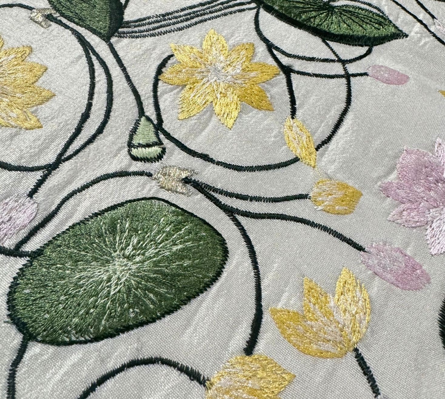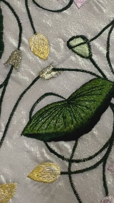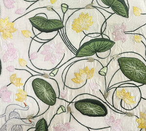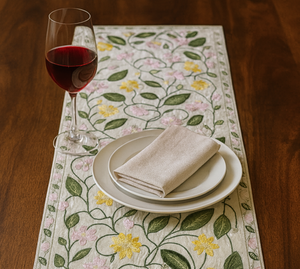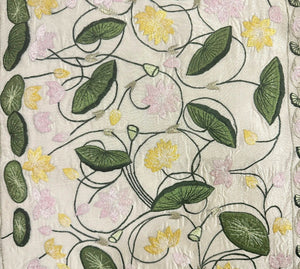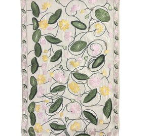Our lotus embroidered runner is truly special—a labor of love and artistry. The off-white base provides the perfect backdrop for the delicate lotus flowers and lush leaves, embroidered in silk resham with beautiful shades of pink, yellow, and green. The zari detailing adds just the right touch of grace, making the design come alive. Every stitch reflects elegance, and the result is nothing short of splendid and breathtaking.