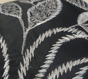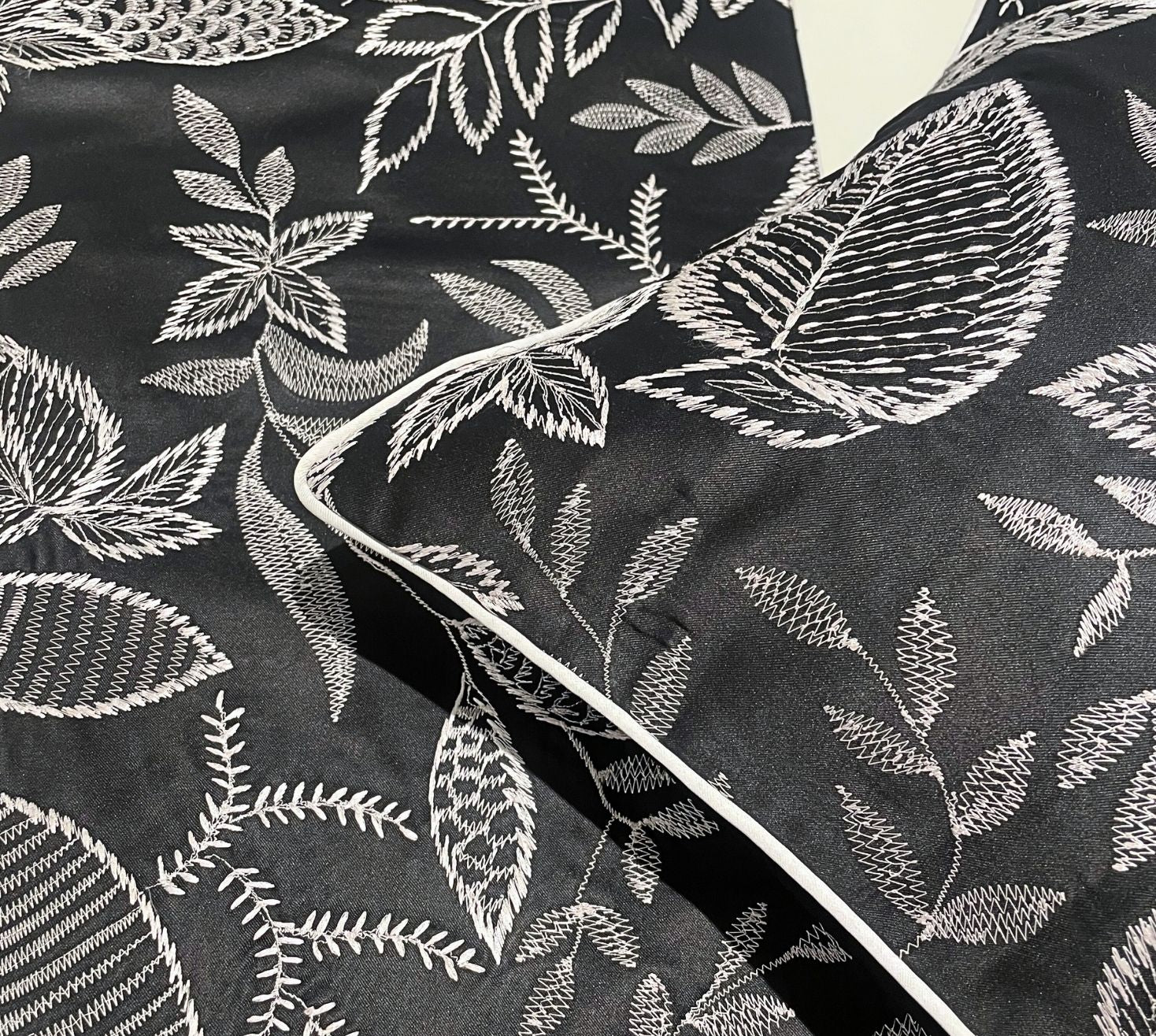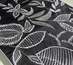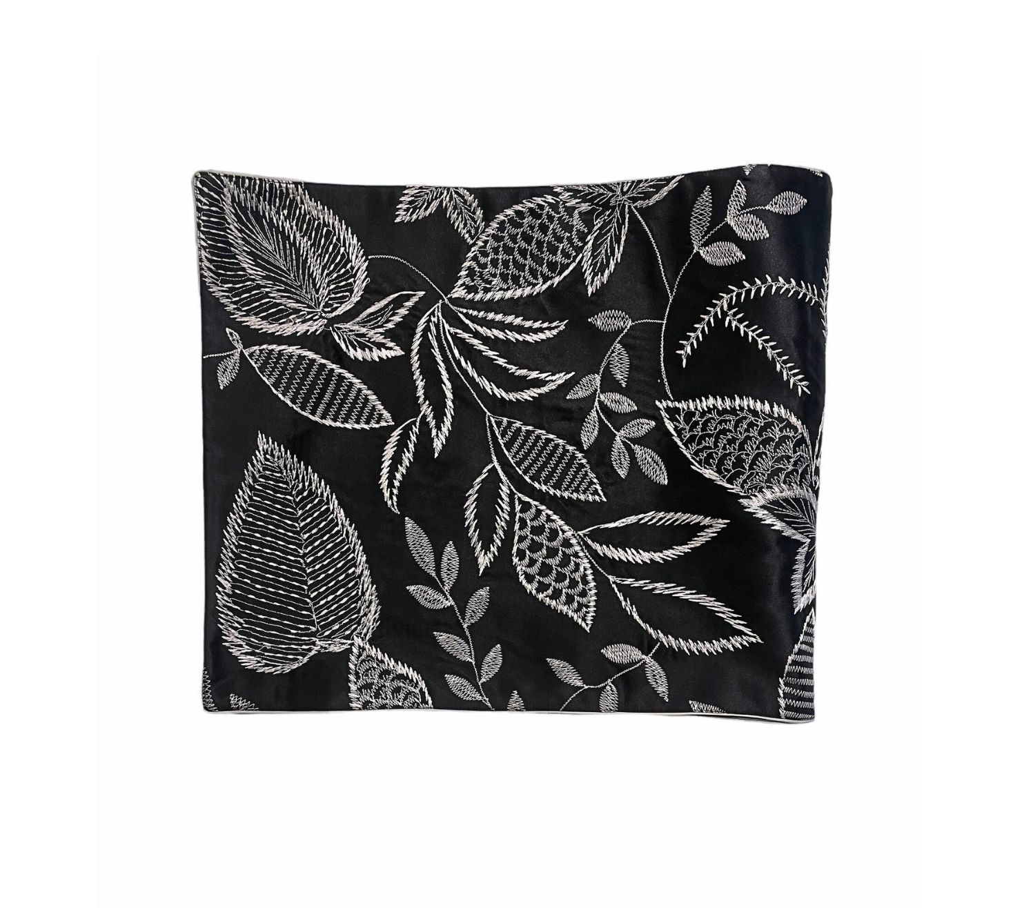 Crafted from luxurious black satin with white embroidered leaves and flowers, this runner is meticulously stitched across the entire length of the runner, forming an eye-catching pattern.
