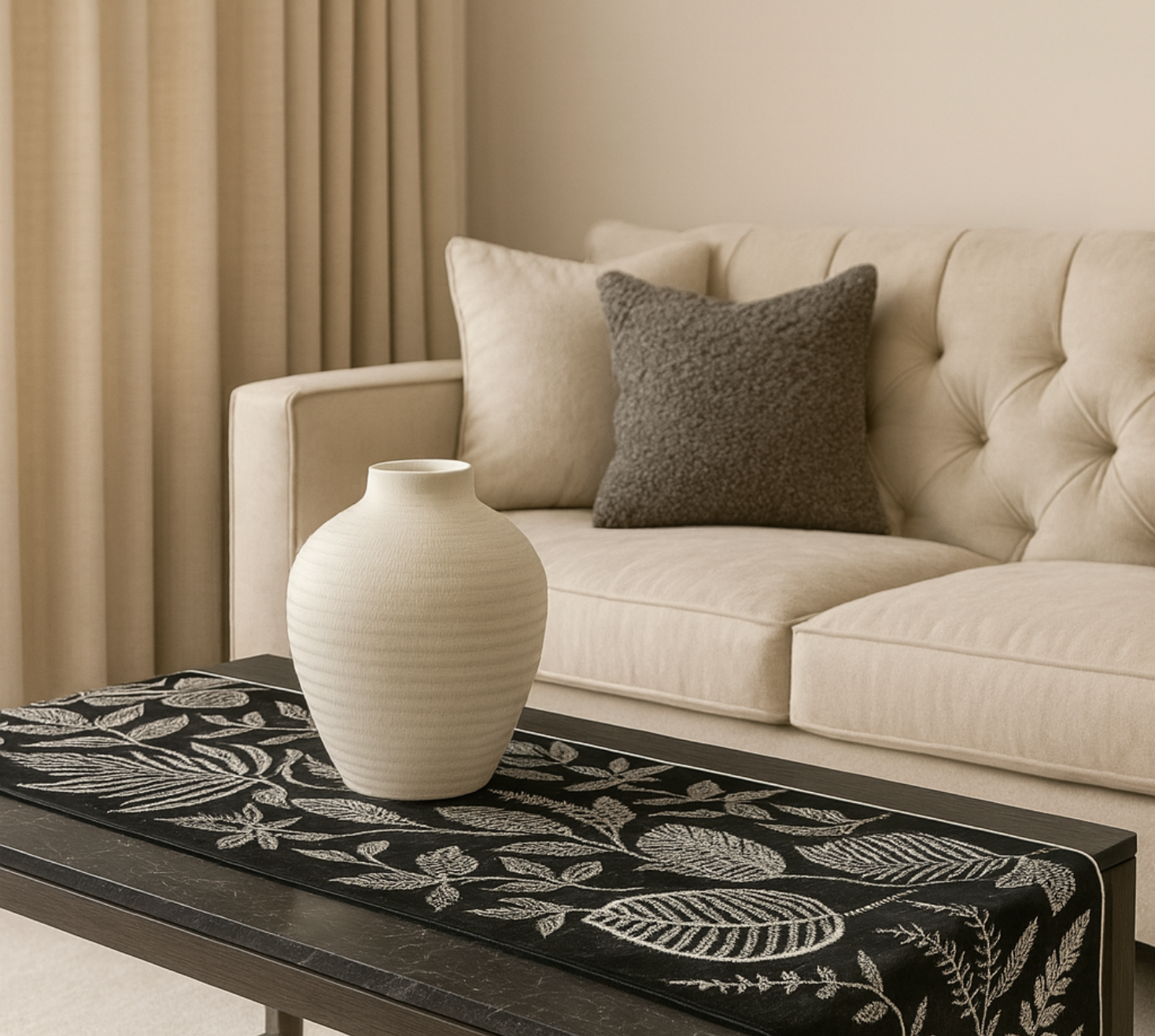 The monochromatic palette ensures versatility, allowing the runner to complement various settings and themes effortlessly. Whether used in modern, minimalist spaces or more traditional, ornate setups, the design seamlessly adapts to its surroundings. It can enhance a dining table, console, or even a dresser, adding a touch of elegance without overpowering the decor.