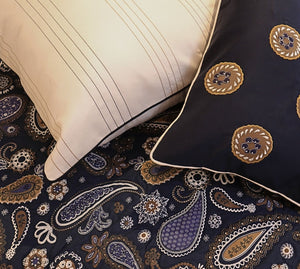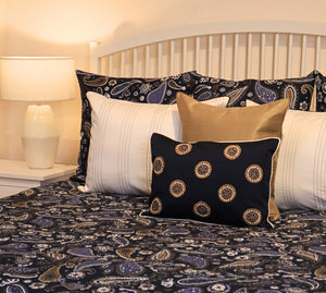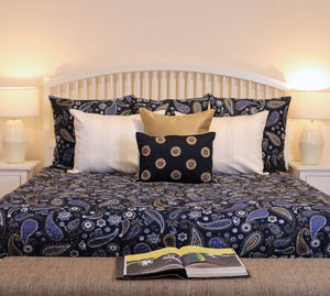 A pleasant welcome in soft cotton, this printed paisley bed cover set is eye-catching. Soft to the touch, it'll provide comfort and beauty at the same time. Lined with cotton and cotton sheeting, the bedding can cover as a comforter as well. The 20/20 inch silk cushion is sandwiched between 2 embroidered shams in white cotton and a resham embroidered and patchwork piece in the centre steals the show with 3 big handcrafted square cushions.