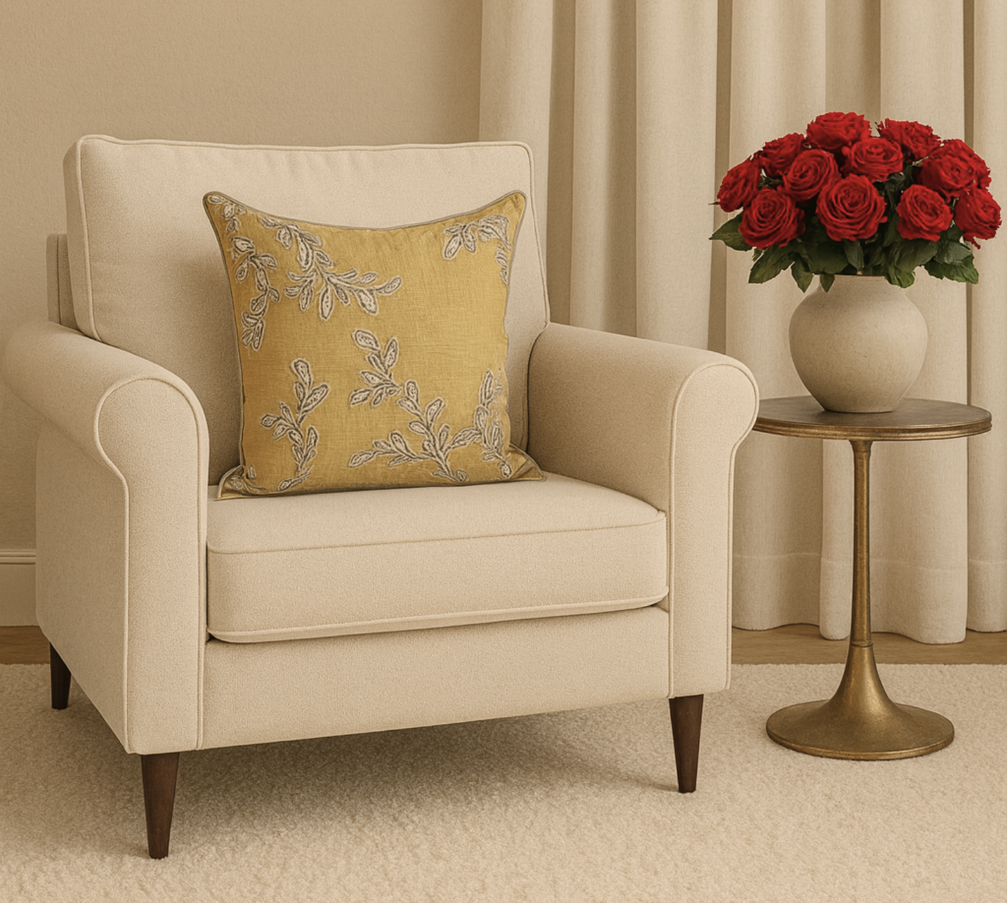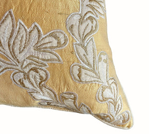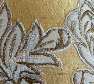 A charming setting and a layout of embroidery that transports into a dreamy world of luxury. The cushion cover is patch worked with off-white cotton satin leaves and then further embellished with silk resham and zari in white and gold.