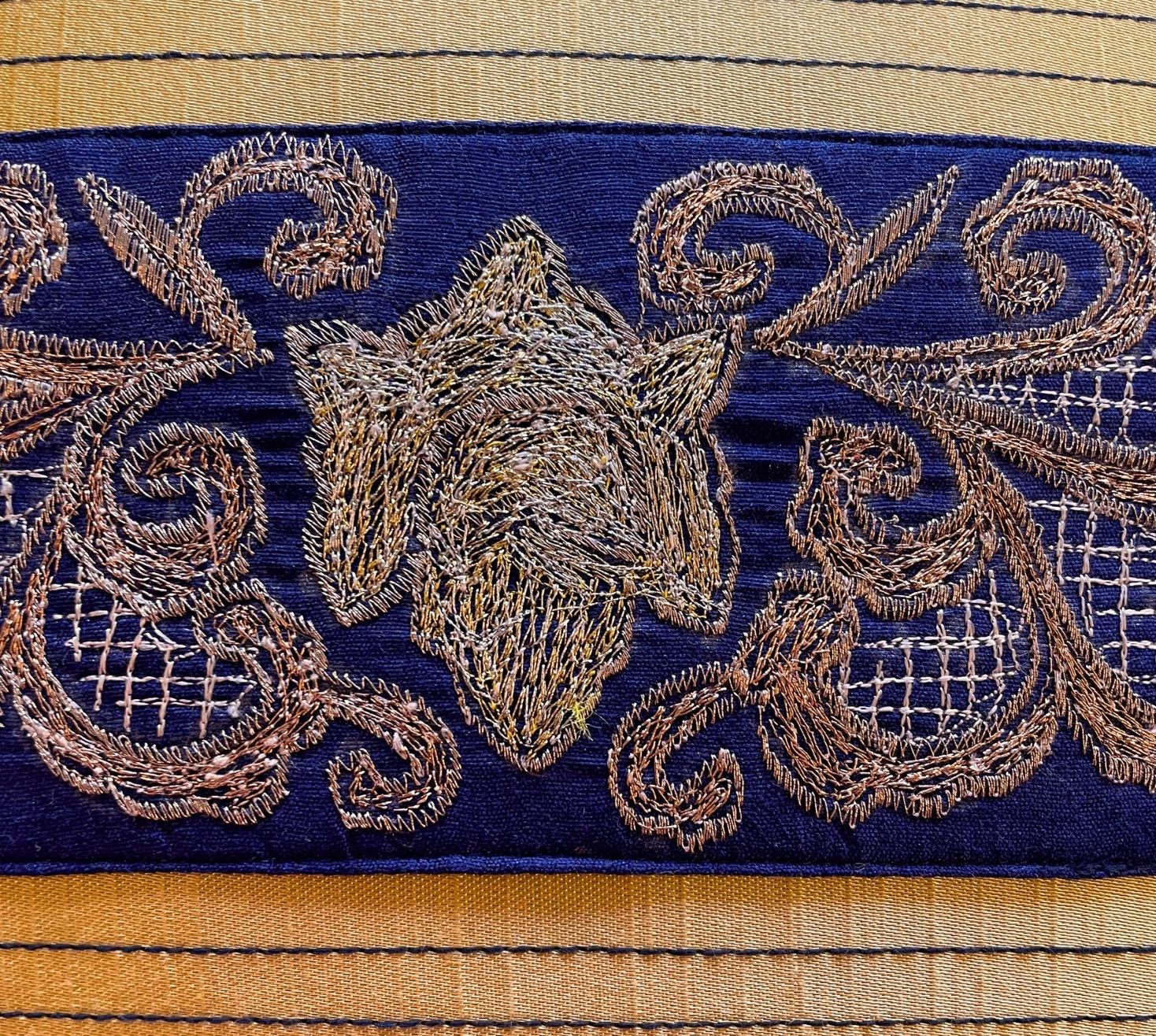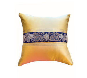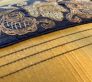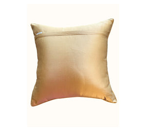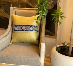 Intricately embroidered with 3 shades of zari is our artistic floral cushion cover in 20''/20'' forming a net base in the centre. The hand embellished cushion cover is made in fine satin and is finished with similar piping and navy resham threads running parallely to add a contrast to the striking piece. It is graceful and majestic and will make a stunning evening wear to your lounge. Pair it with a single seater or with a group, it is an eye catching piece.