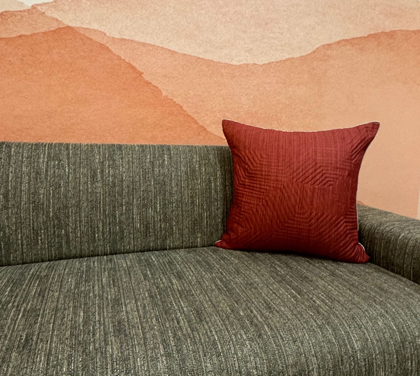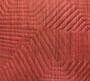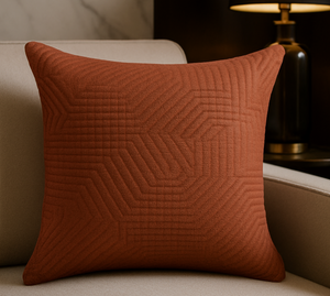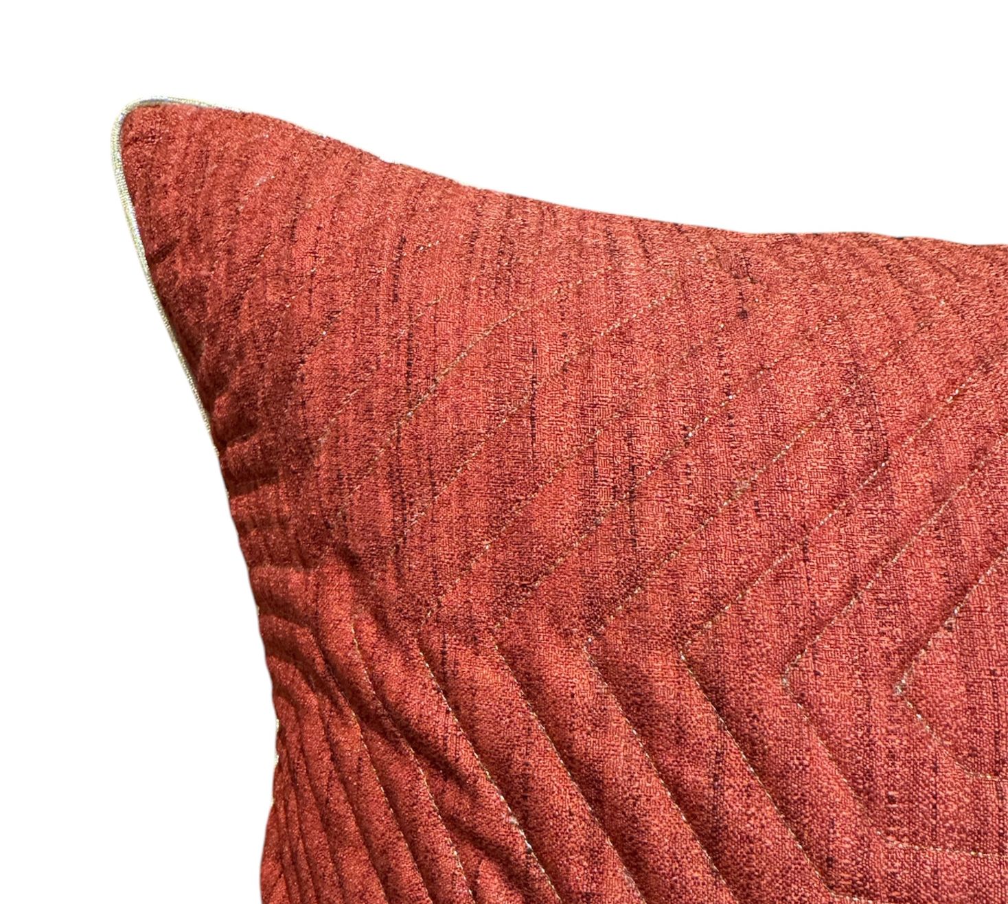 Crafted from mixed dupion fabric in a rich rust hue, it features a quilted design that adds depth and visual intrigue. The abstract zari embroidery, executed in shimmering gold metallic threads, weaves dynamic patterns across the surface, offering a contemporary yet artisanal flair. Together, these elements create a piece that effortlessly combines rustic charm and evokes warmth and dreamlike elegance.