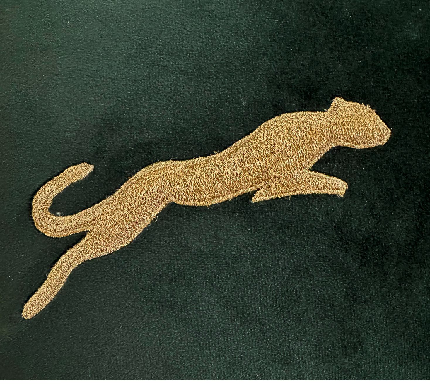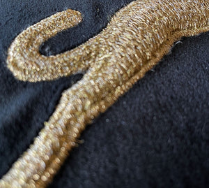 A majestic leopard, intricately embroidered in golden zari, comes to life on deep olive velvet. The rich contrast of shimmering gold against the lush fabric exudes elegance and sophistication. A statement piece that blends luxury with the wild beauty of nature.