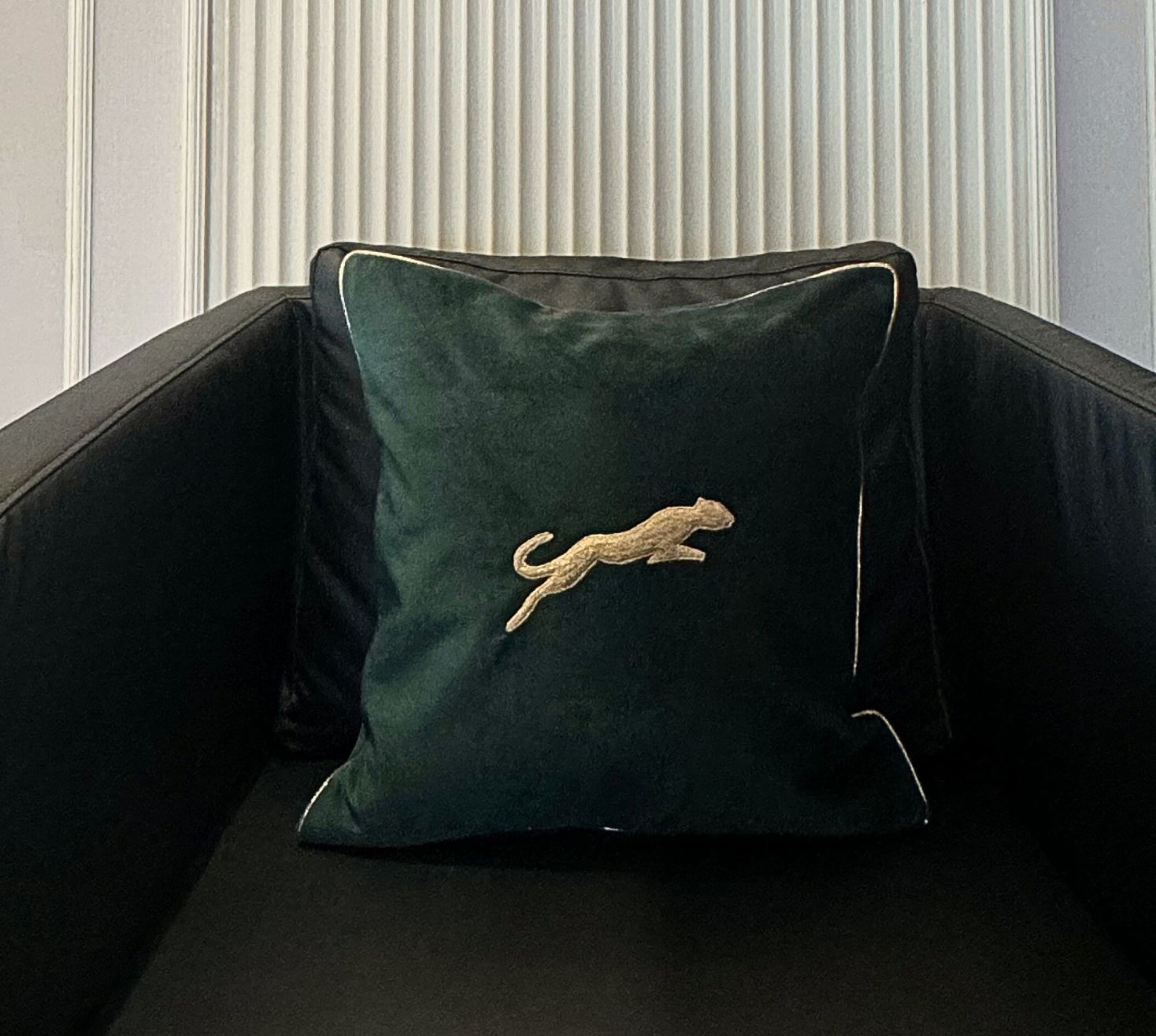Set against the deep richness of olive velvet, it tells a story of quiet strength and timeless luxury. The contrast is striking, heritage meets modern elegance, wild spirit softened by plush, indulgent texture. Each cushion feels like a collector’s piece, adding depth, drama, and distinction to any space.