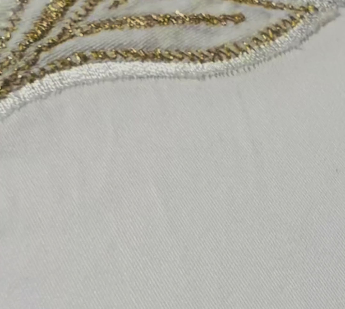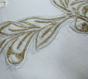 A charming setting, a soft demeanor and a layout of embroidery that transports into a dreamy world of luxury. The cushion cover is patch worked with off-white satin leaves and then further embellished with silk resham and zari in white and gold.