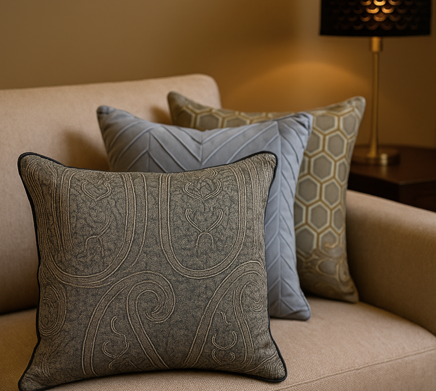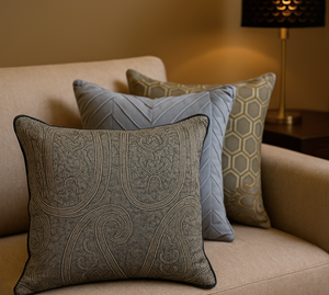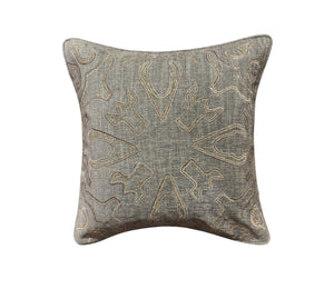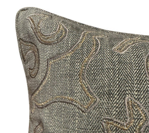 Our cushion cover marries the classic texture of grey herringbone fabric with striking abstract embroidery. The dynamic, fluid motifs rendered in contrasting hues create an engaging piece that exudes contemporary sophistication. Ideal for adding an artistic yet refined touch to any space, this piece embodies both modern design and timeless elegance.