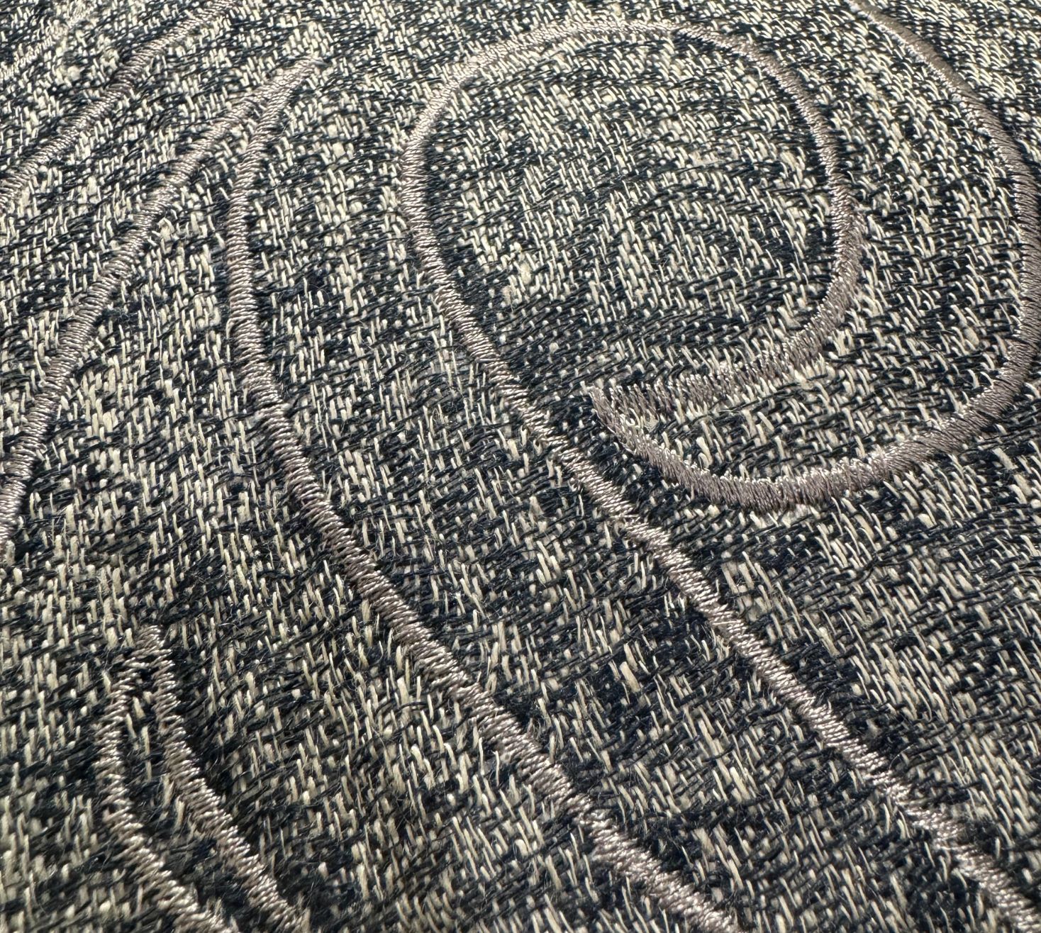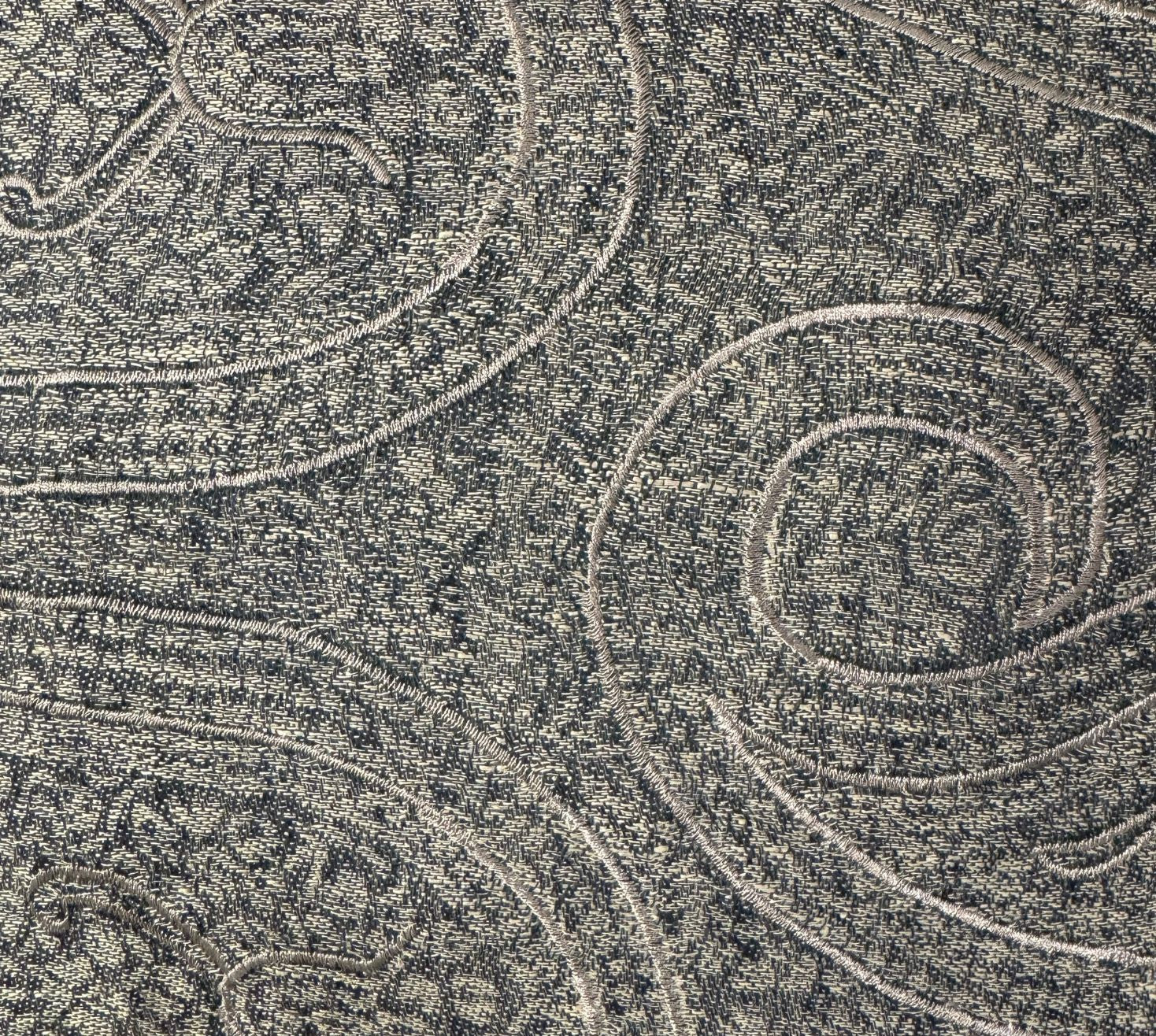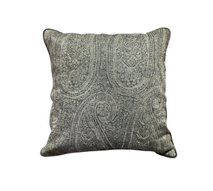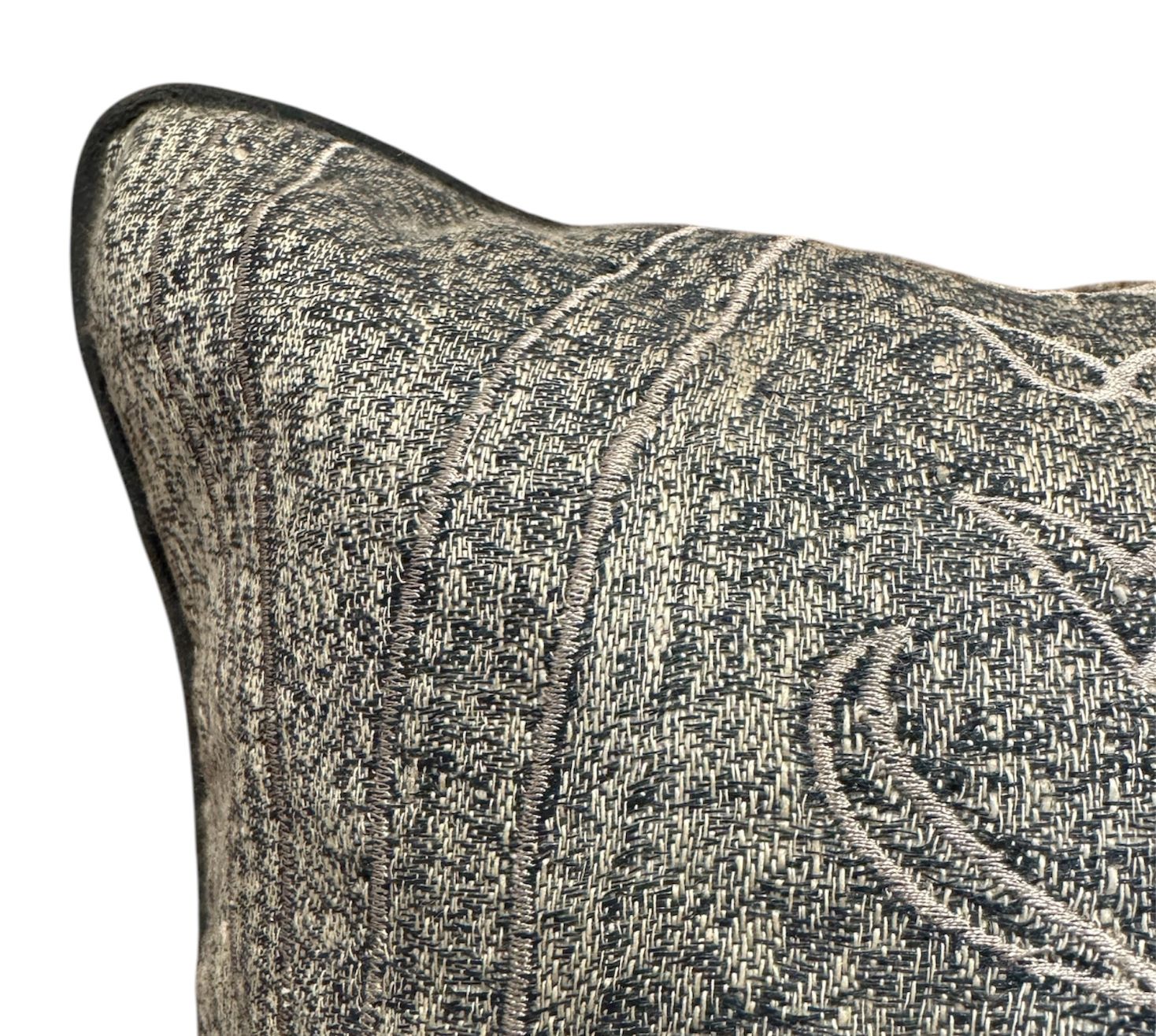 A refined cushion cover crafted from soft linen, featuring an intricate paisley design elegantly accentuated with delicate silk embroidery. The embroidered motifs add a touch of sophistication, creating a subtle yet striking contrast against the linen’s natural texture and is further embellished with a velvet piping.