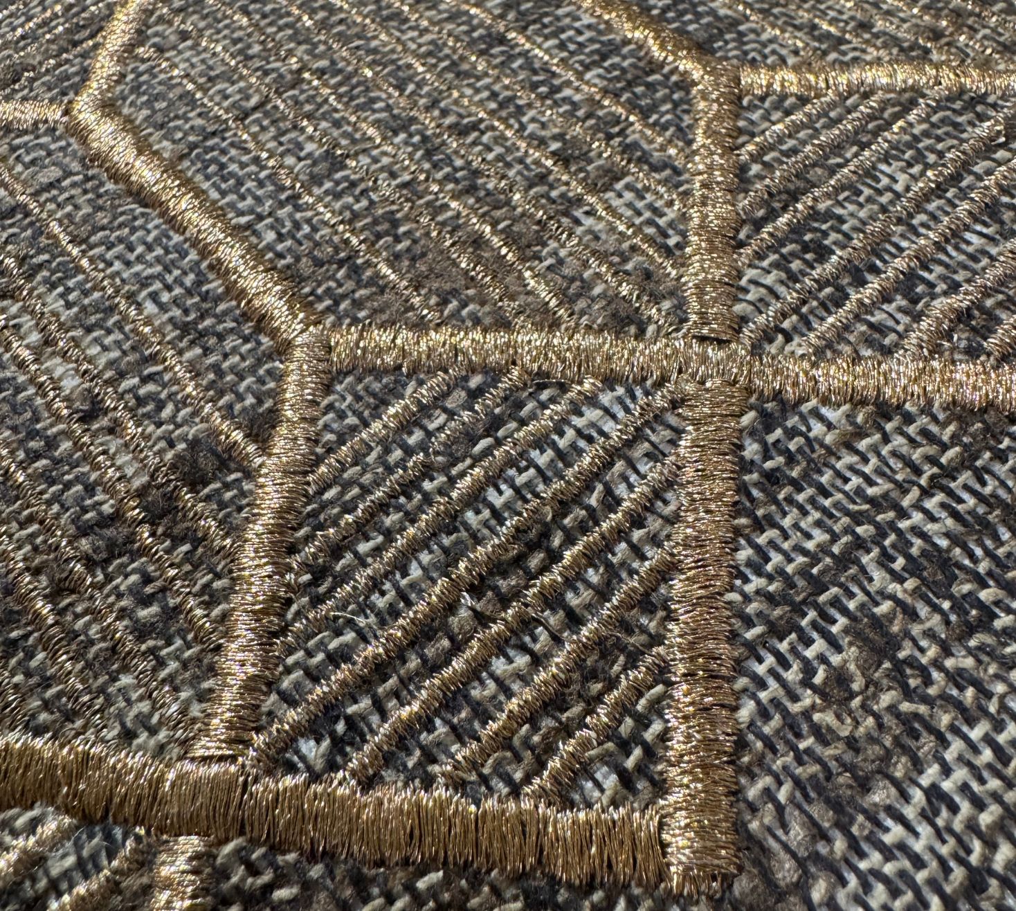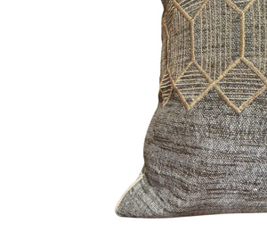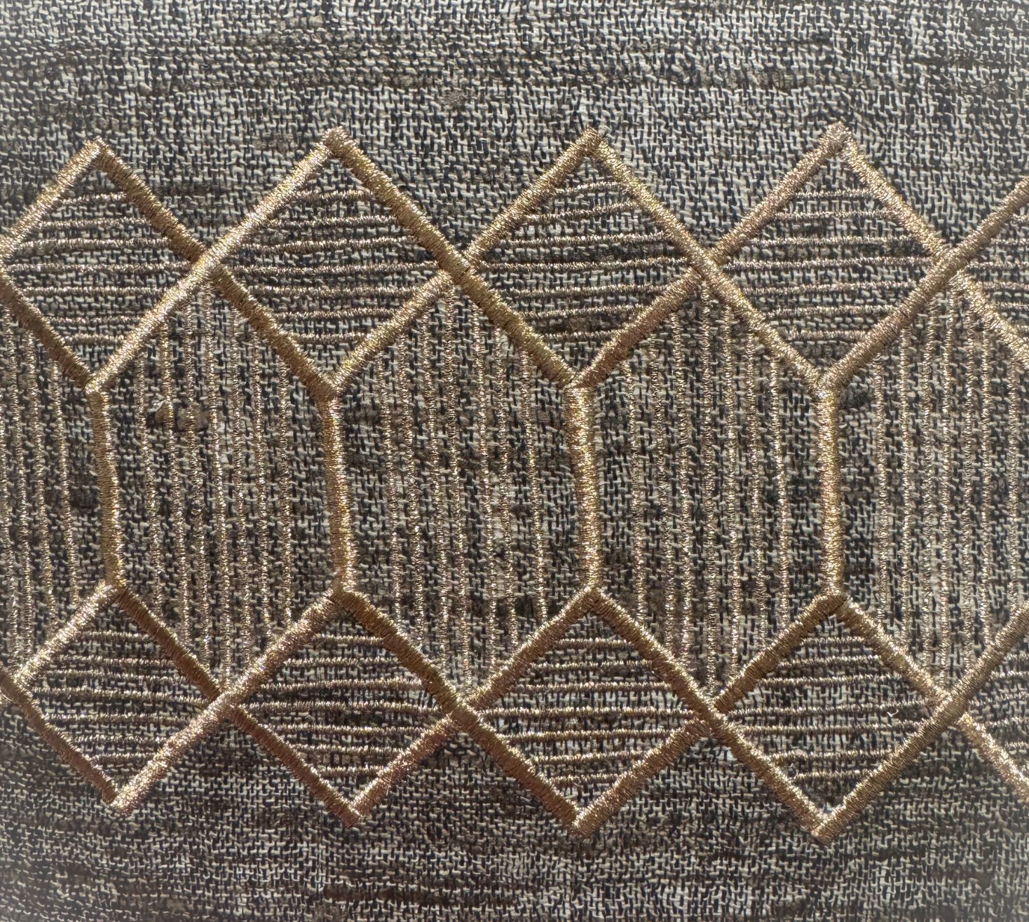 This exquisite cushion cover is crafted from aviator khadi, a fabric rich in texture and depth. At its center, a striking hexagonal zari embroidery in luminous copper takes the spotlight, adding a refined geometric elegance. The natural texture of the khadi base enhances the design’s nuanced charm, creating a harmonious balance between raw authenticity and sophisticated craftsmanship.