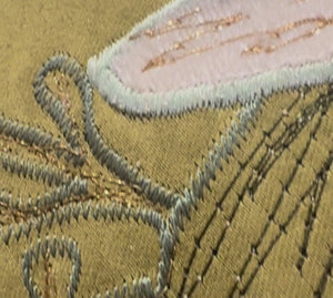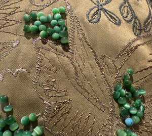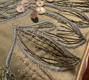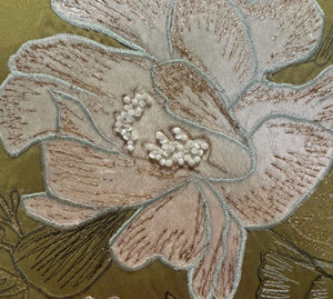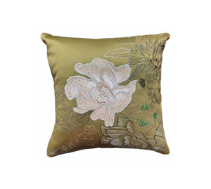 Crafted from lustrous olive satin, this cushion cover is a true work of art, featuring an expansive canvas of exquisite embroidery. The design is brought to life through meticulous patchwork, skilfully accented with fine silk thread and shimmering zari, creating a rich display of textures and patterns. To further enhance its grandeur, delicate white beads are carefully placed, adding a touch of refinement, while golden square sequins catch the light, imparting a regal glow.