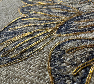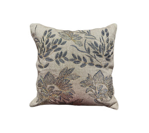 Indulge in the charm of our neutral textured linen cushion cover featuring floral and leaf embroidery, crafted with dori and silk resham threads, and elegantly finished with gold dori detailing. The cushion evokes the feeling of grace and majesty and looks resplendent.