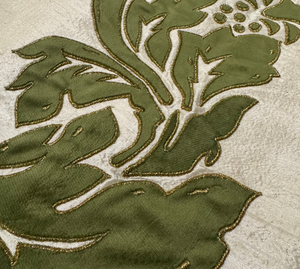 Crafted from pure off-white raw silk, this exquisite cushion embodies quiet luxury and timeless charm. The intricate olive-green velvet appliqué forms a graceful botanical pattern, delicately outlined with fine zari embroidery for a subtle shimmer. Every element is hand-finished with precision, blending texture, sheen, and elegance effortlessly. Its neutral base and rich green tones make it a versatile accent that pairs beautifully with a variety of cushion styles and colors. Sophisticated yet understated, it adds a refined, artisanal touch to any living space.
