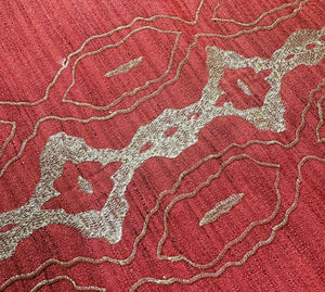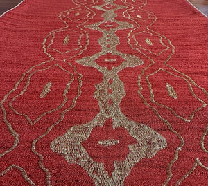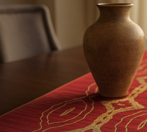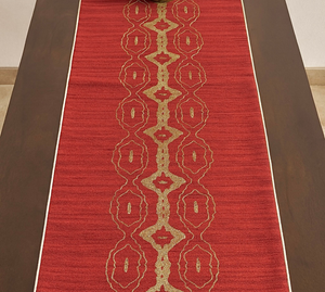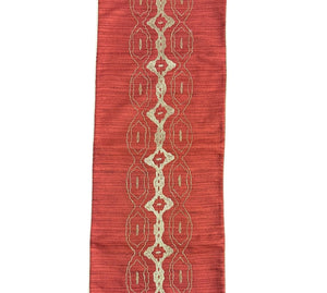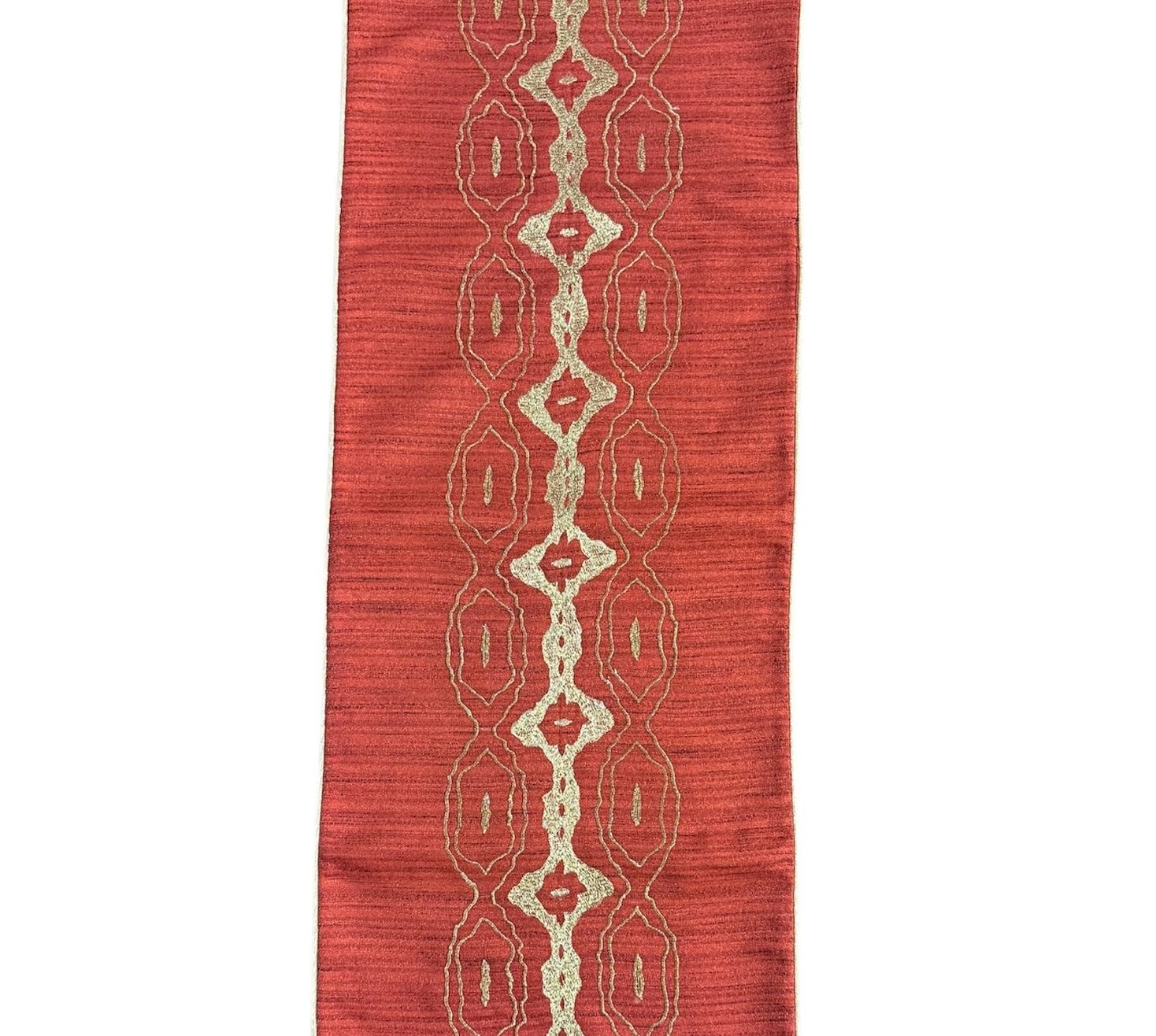 This elegant table runner features a reddish orange mixed dupion base, adorned with intricate golden zari embroidery running gracefully through the center. The shimmering embroidery adds a luxurious touch, making it a stunning centerpiece for your dining table. Expertly crafted with attention to detail, this runner combines timeless design with a vibrant colour palette, perfect for elevating both festive and everyday settings.