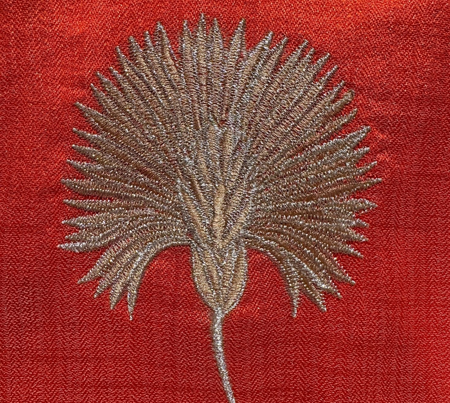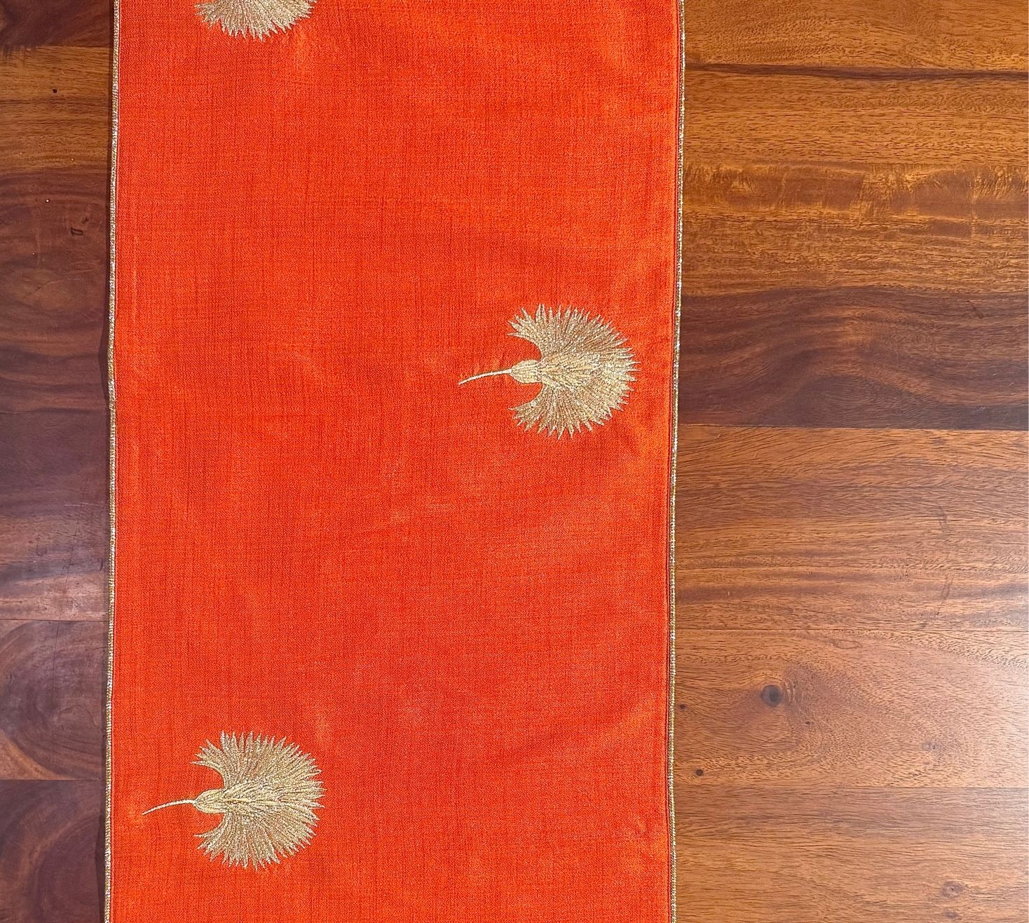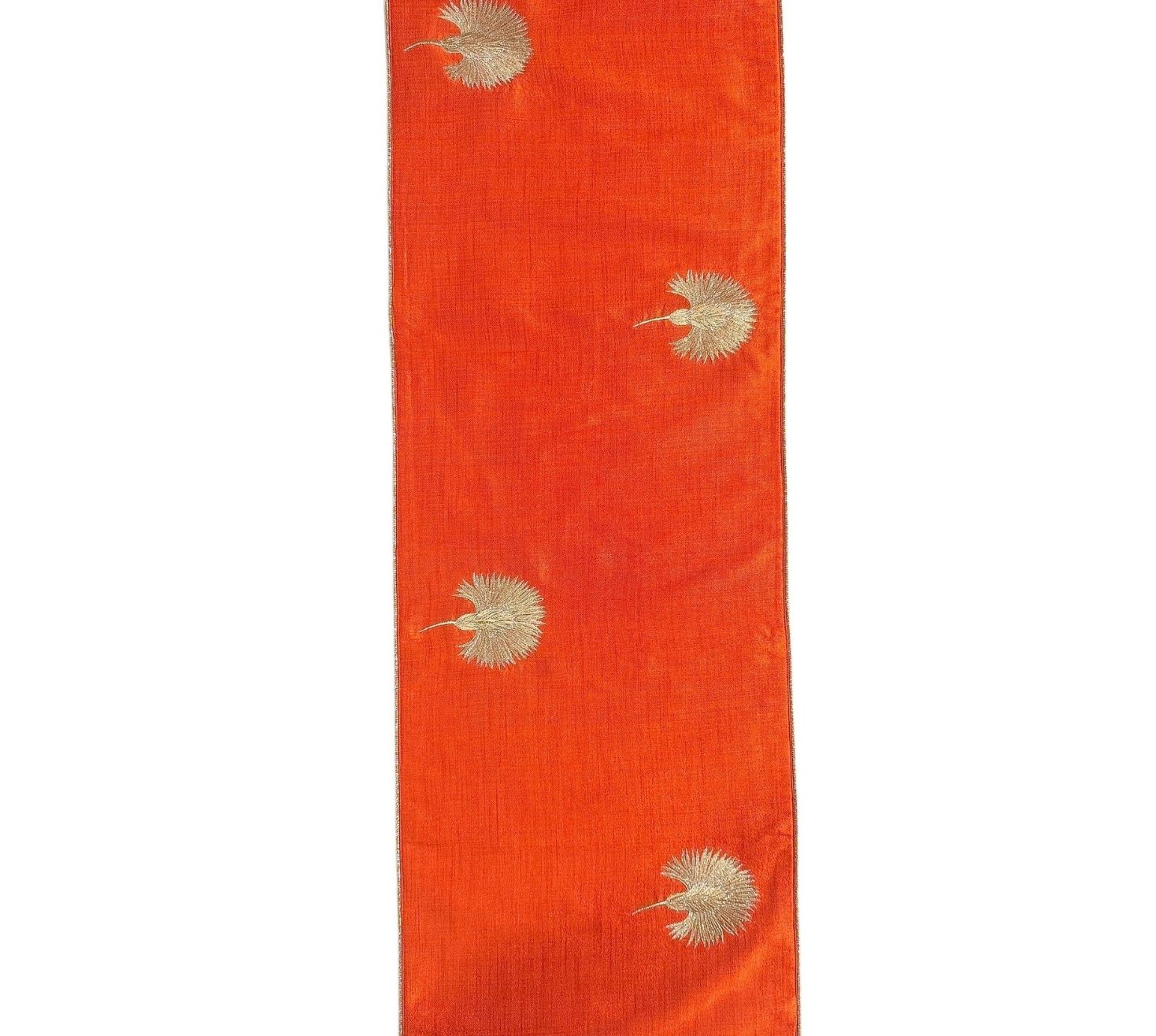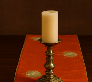 Our rust-colored Dupion runner is a blend of warmth with delicate flowers, embroidered with two shades of zari, that add shimmer. The rich texture of fabric enhances its timeless charm and is a perfect piece for bringing a touch of grace and sophistication to your home.