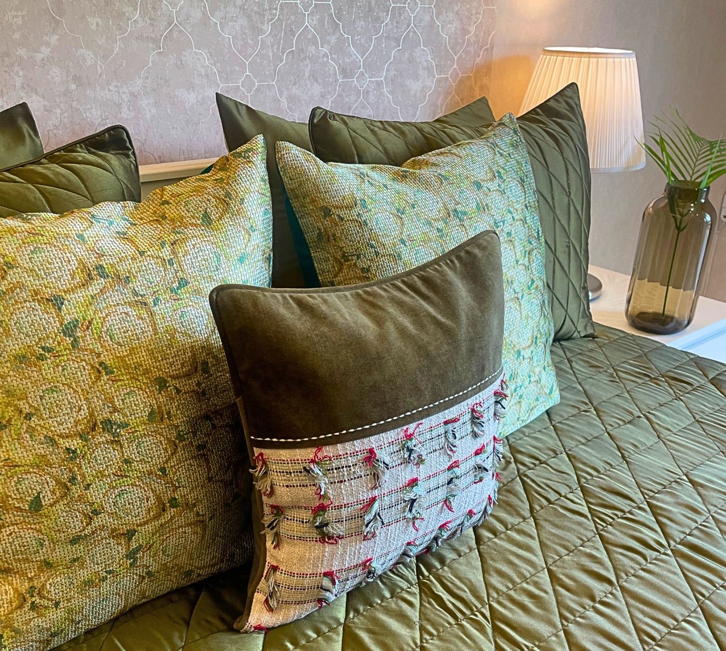 Enliven your room with our uber - soft satin bedding set. The collection is quilted in a rhombus pattern that is replicated on the pillows. The other set of shams are plain satin accompanied with a pair of 20''/20'' cushions in shades of textured green. The stylish and sharp bedding will enhance any coloured bed back and infuse life in your room. With an ascent cushion of the same colour palette , we have a 16''/16'' piece in velvet and cotton Jacquard that completes the ensemble.