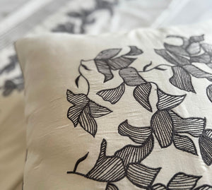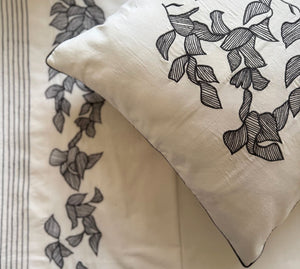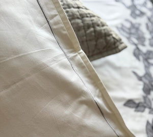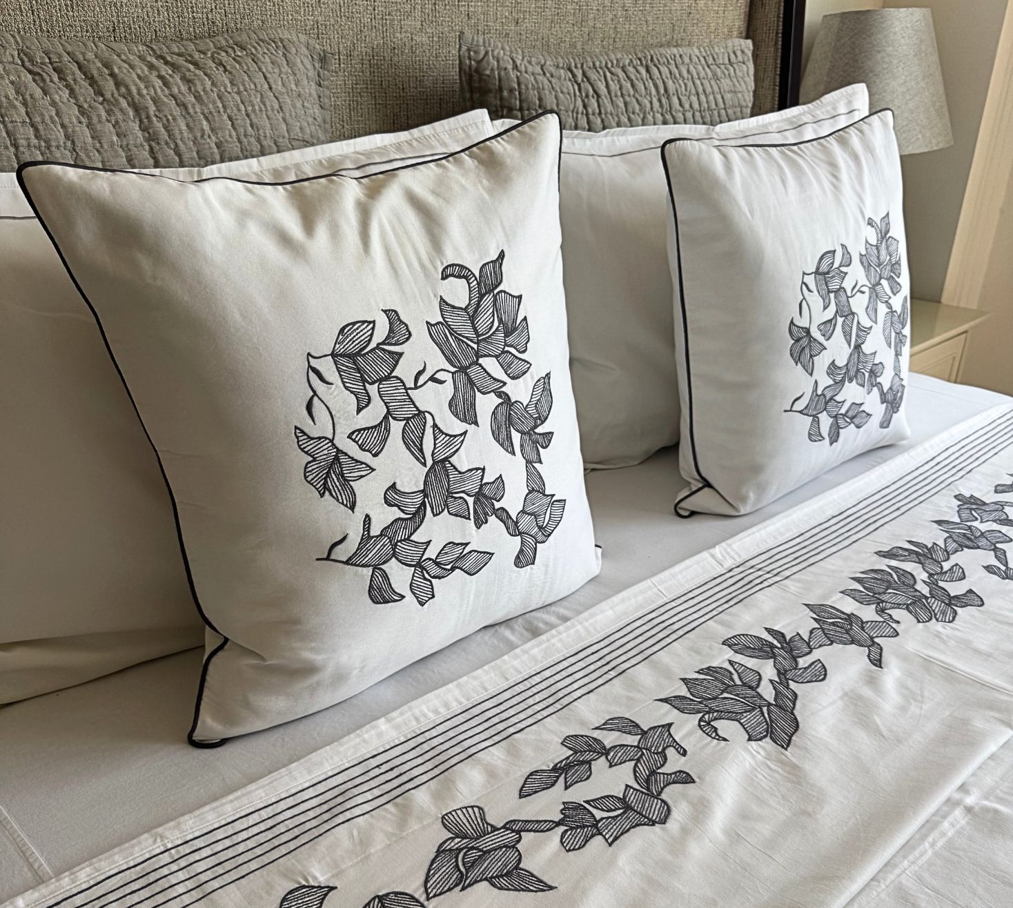 The grey line embroidery on the 4 sides of the pillow and the hand embellished 20"/20"'pieces clubbed with big grey square cushions in linen at the back add a beautiful contrast to the collection. Minimal yet indulgent, practical yet timeless, it’s more than just bedding, it’s the upgrade your home deserves.