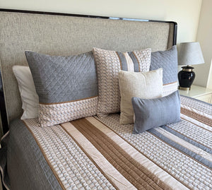 Crafted in soft, breathable cotton, our printed quilted bedspread is designed for both comfort and style. The quilt features a unique combination of three to four subtle textures, arranged in a clean, longitudinal layout running from head to toe. In a serene palette of greys, off-whites, and a hint of soft brown, it brings a refined, contemporary warmth to any space.