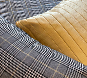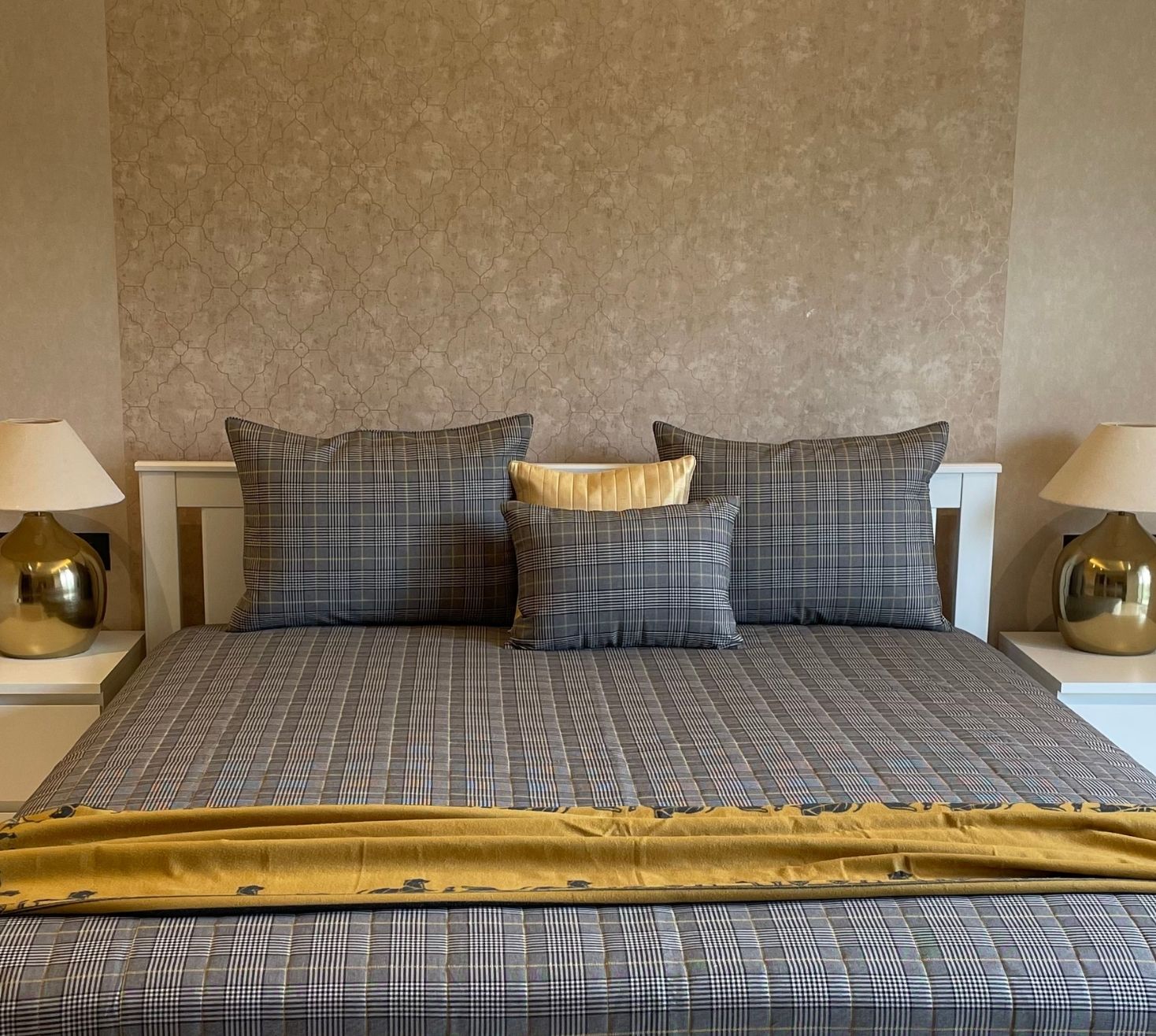 Can't resist the charm of our collection making a statement with well defined checks in greyish black and a tuscan sun embroidery across the piece. Clubbed with a silk cushion in 20''/20'' and a pair of pillows and a similar ascent cushion, the bedding is effortless and personifies excellence. The upper and lower fabric is cotton with a square quilting and a fine cotton filling that makes it an ideal choice to be used ac a conforter or a layering piece over a duvet. The set makes an august and welcoming choice for your room