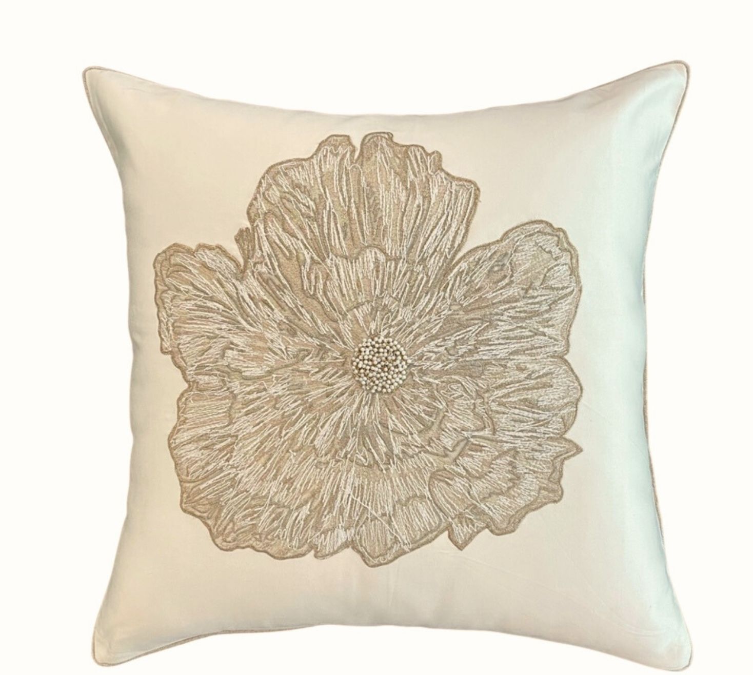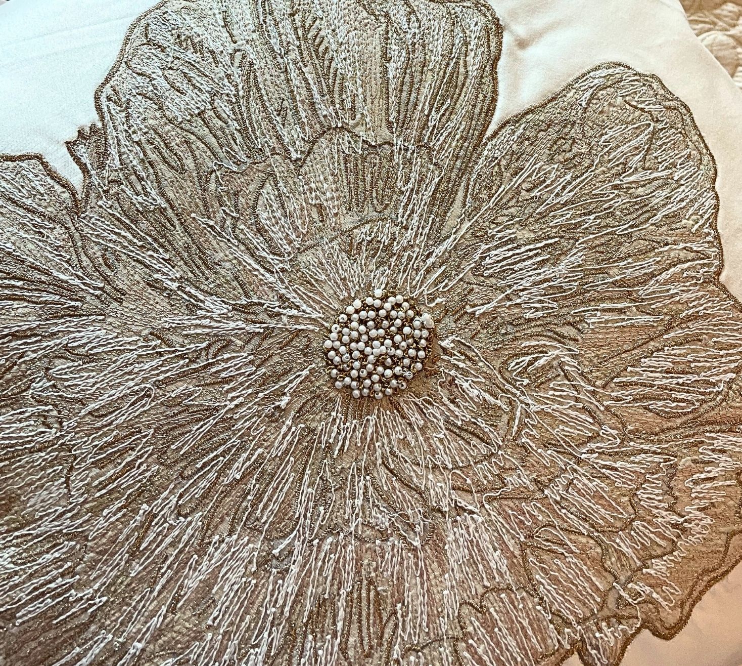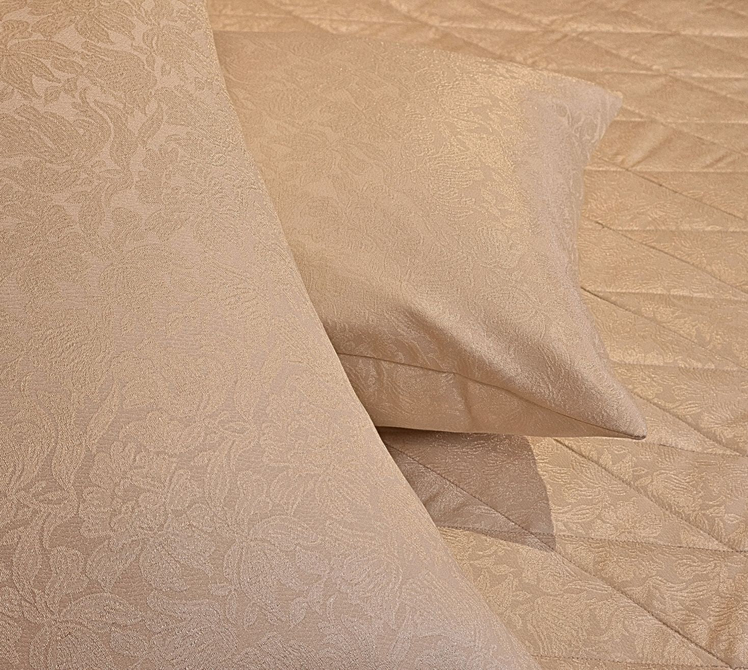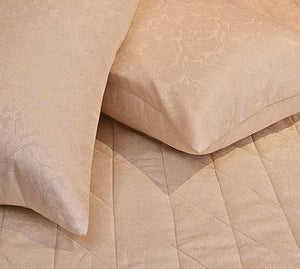 Deep dive into this luxurious king sized quilted bed cover set that is beyond charming. An ethereal look that is soft and distinguished, the set concerts 2 shams in 20/26 inch, a floral hand embellished cushion in shades of gold and off white with pearl beads in embroidered in the centre in 20/20 inch and a textured cushion in 20/20 inch. The ascent cushion is of the base fabric of the bedding which is a self-muted floral jacquard in off white.