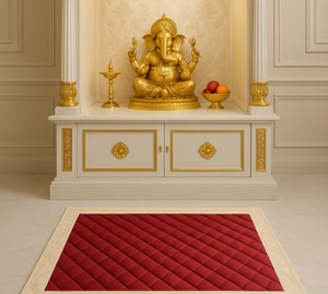 Framed with an elegant brocade border, it adds a traditional touch to your spiritual rituals. The sitting area is delicately quilted, providing gentle padding for extended moments of prayer or meditation. Light yet plush, it’s designed to be both functional and beautiful. Ideal for home mandirs or travel, this mat is a blend of devotion, design, and everyday ease.