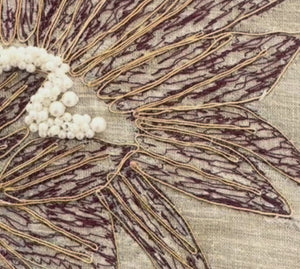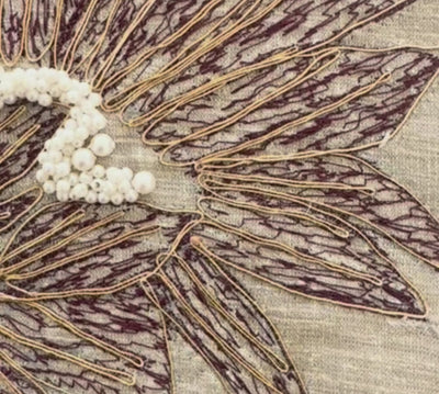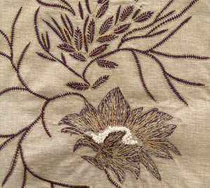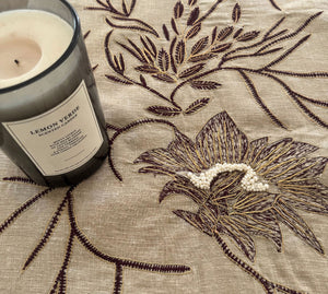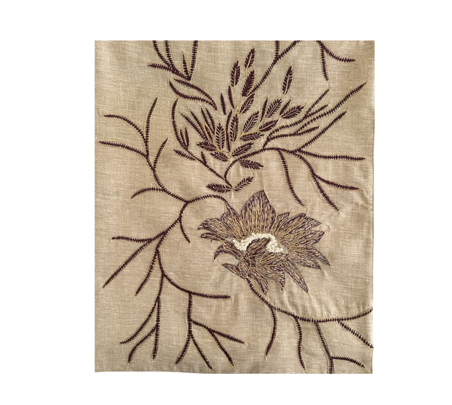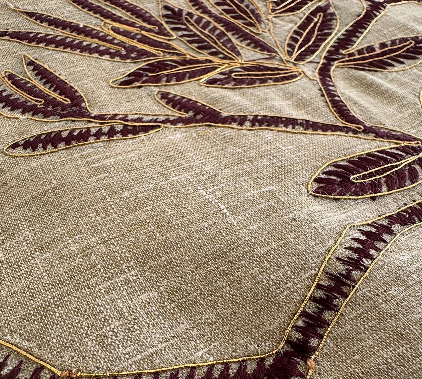 Thoughtfully designed for those who appreciate quiet luxury, leaves of tranquillity is a table runner set that speaks in elegant, understated tones. Set against a khaki cotton-linen base, the maroon resham thread gracefully traces delicate leaves and branches—each one outlined in beaten gold thread that catches the light with a soft gleam. Hand-embroidered pearls, both small and medium, nestle along the design like dew on foliage, adding a touch of refined shimmer.