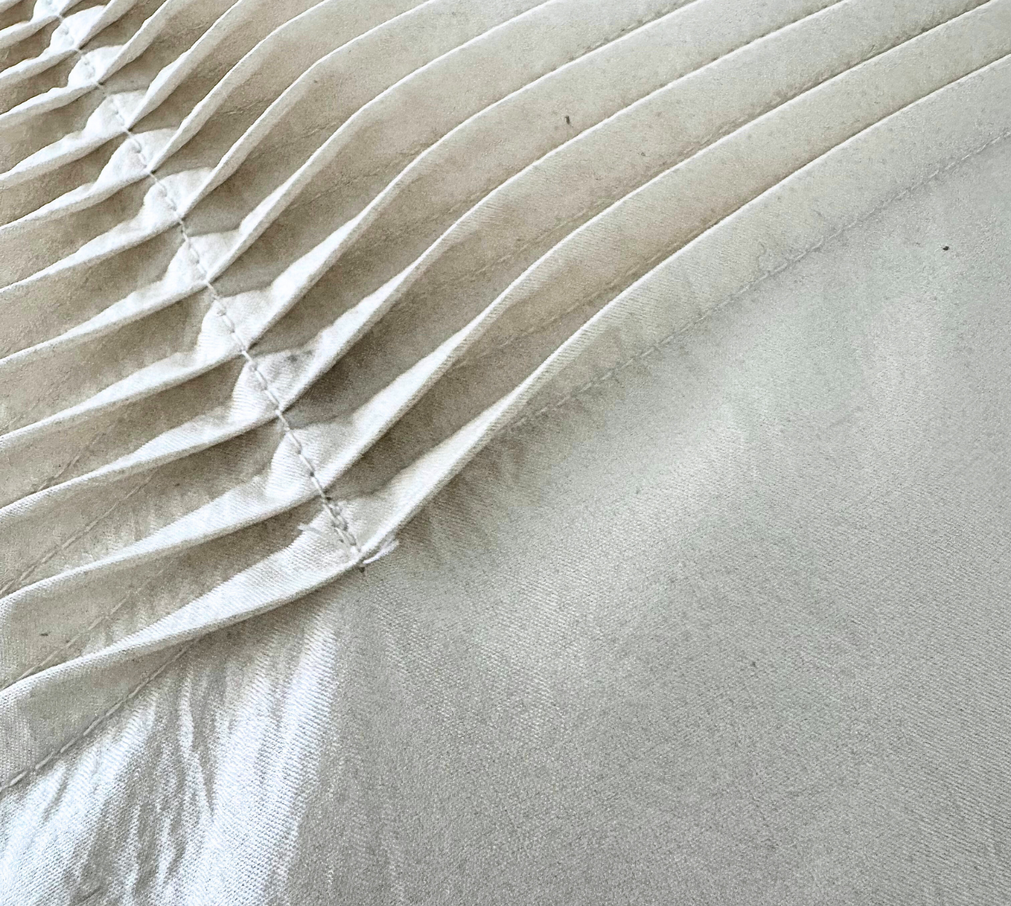 Our sumptuous silk cushion cover is adorned with meticulously crafted pin-tuck pleats cascading through the centre. The delicate folds create a play of light and shadow, adding refined elegance. The off white silk piece transforms any space with its timeless allure. Whether gracing a plush sofa or an accent chair, it whispers luxury in every detail.