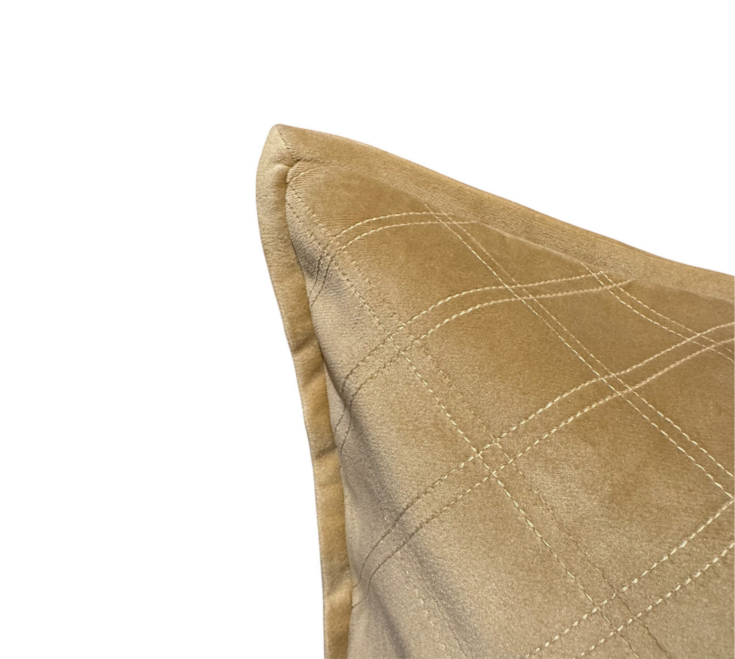Add our luxurious gold velvet cushion cover adorned with twin diagonal embroidery in the same rich hue, creating a subtle yet striking intersecting pattern. The tonal embroidery adds depth and texture, blending seamlessly with the plush velvet surface.