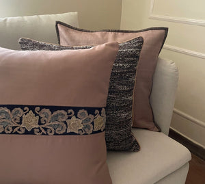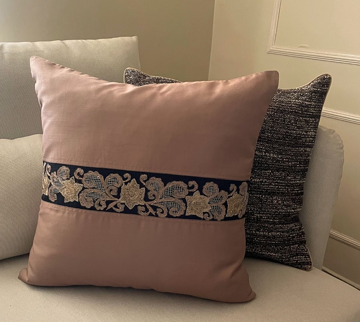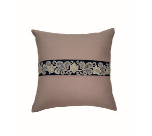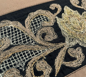 Understated sophistication meets timeless design in The Mocha Vine Cushion. Crafted in a warm mocha base, it features an intricately embroidered central panel — delicate vine and leaf motifs in soft gold and ivory thread set against a rich black band. The contrast is both subtle and striking, making this cushion an effortless blend of classic charm and modern elegance. Perfect for refined interiors, it adds a touch of quiet opulence to any setting, from festive gatherings to everyday luxury.