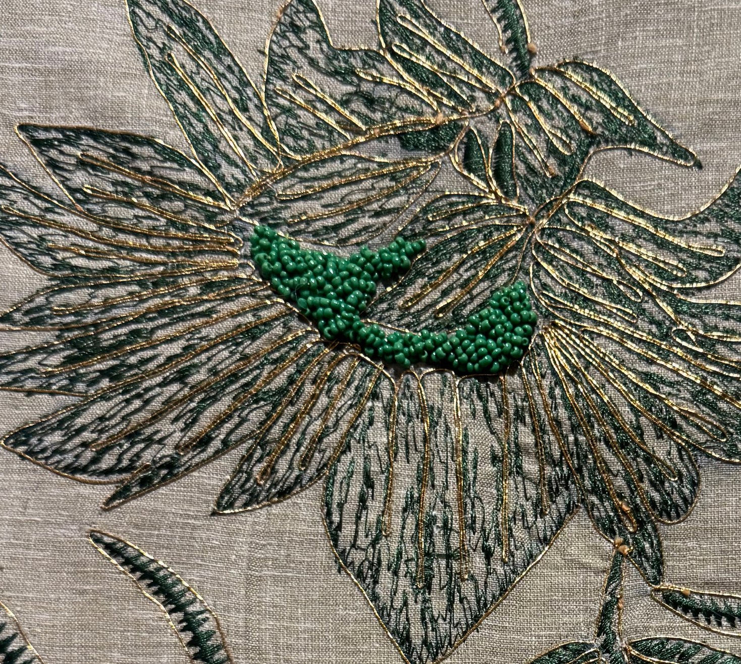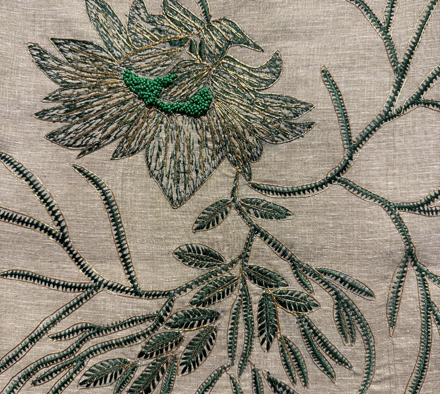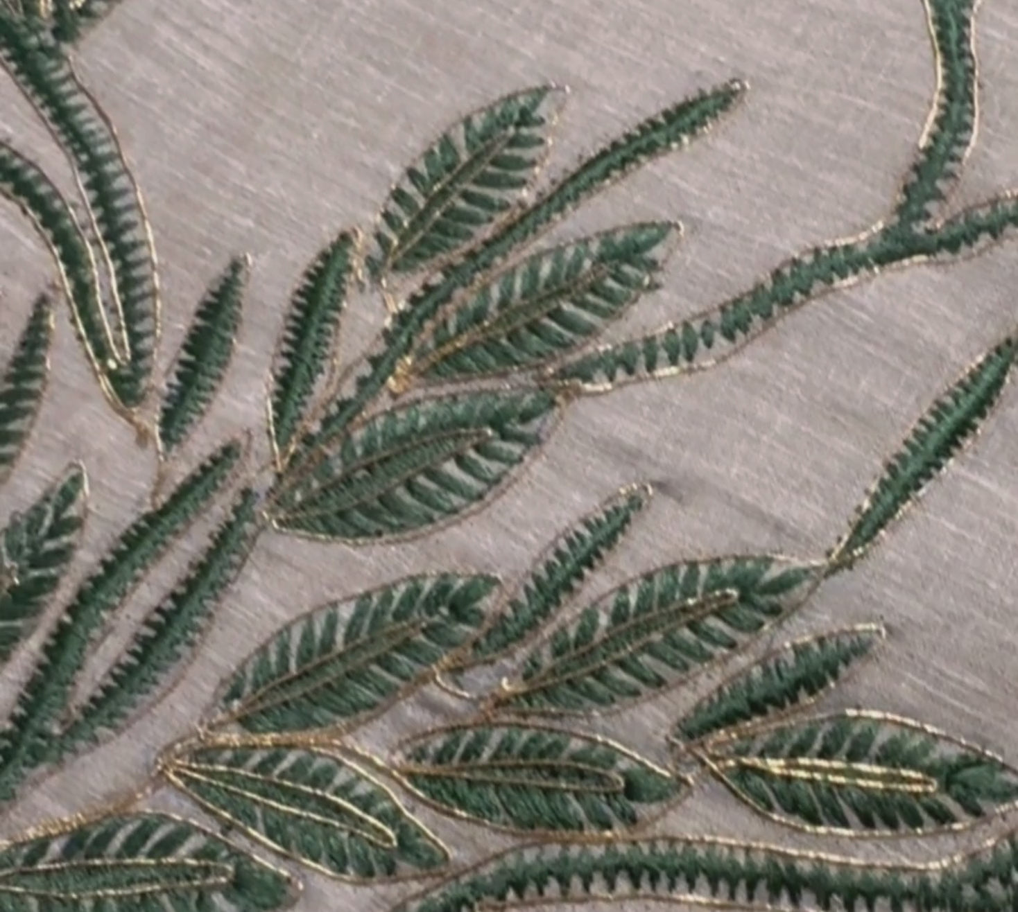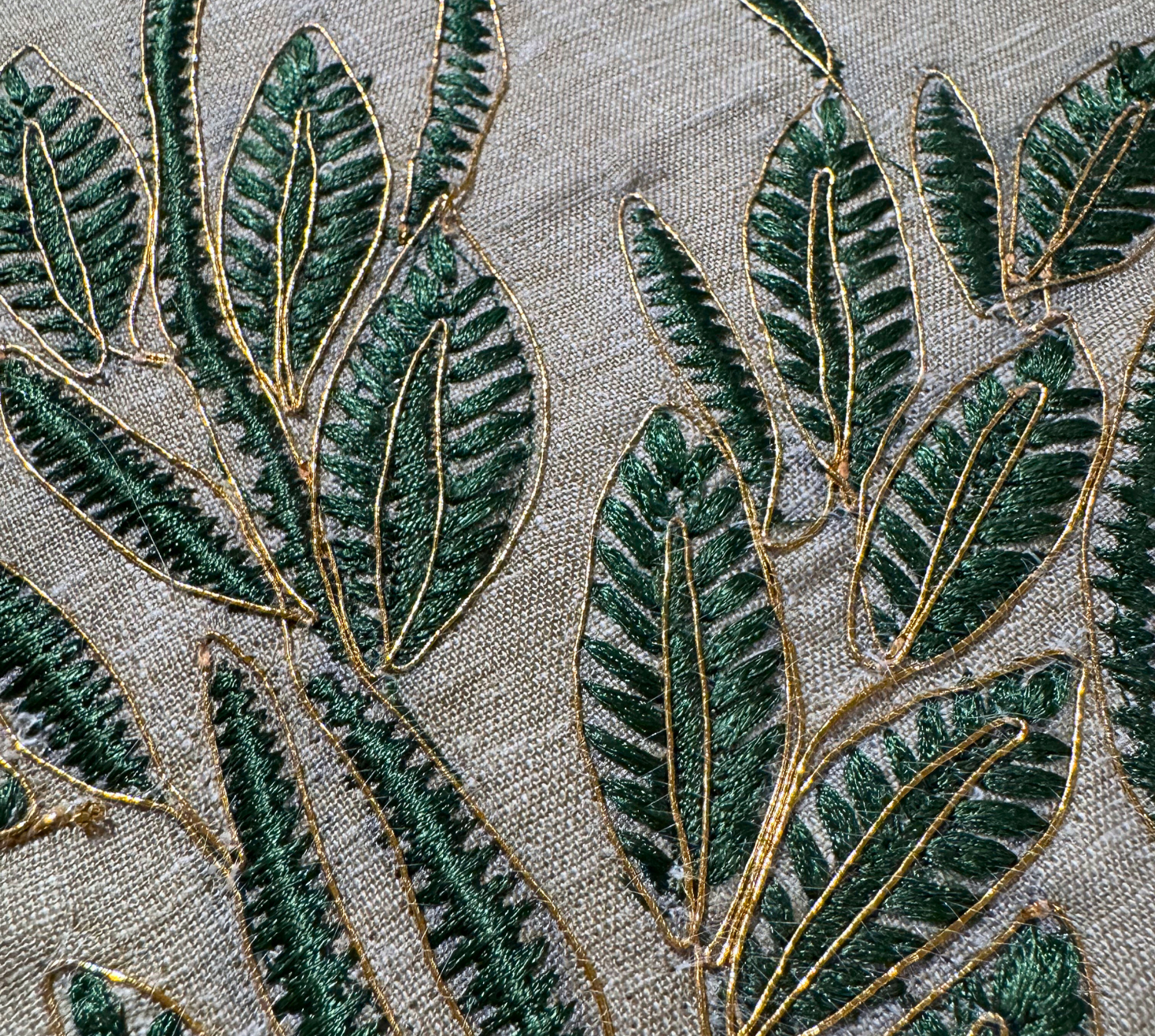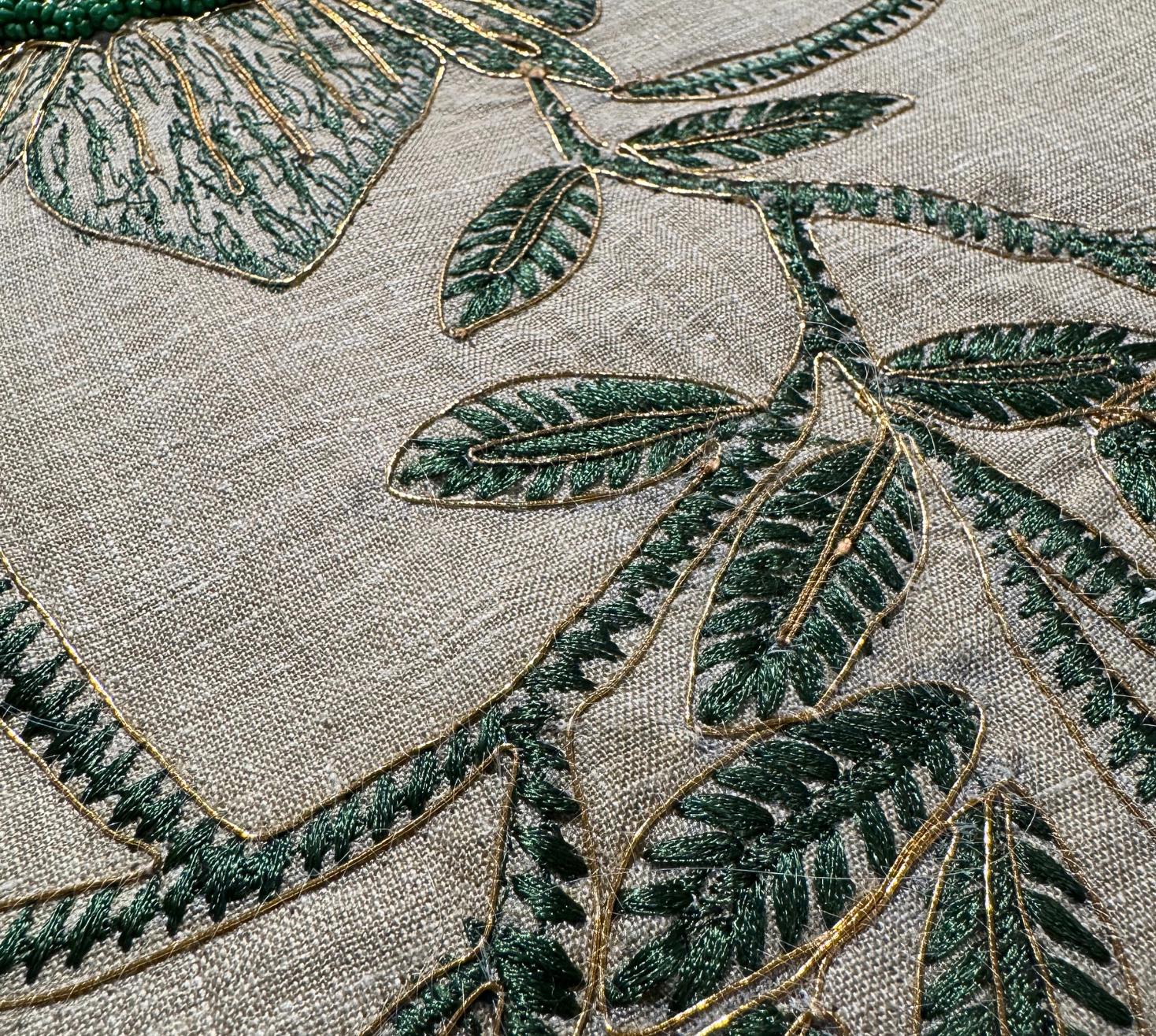 Crafted from a rich cotton-linen blend, this exquisite table runner is fully embroidered with intricate silk Resham thread in a warm green shade and beautifully outlined with golden dori for a regal finish. Further accentuated with hand embroidered jade green beads, our stunning runner can be used for a cotton summery vibe as well as a formal set up. Hand embellished, this collection is one of our favourites.