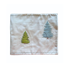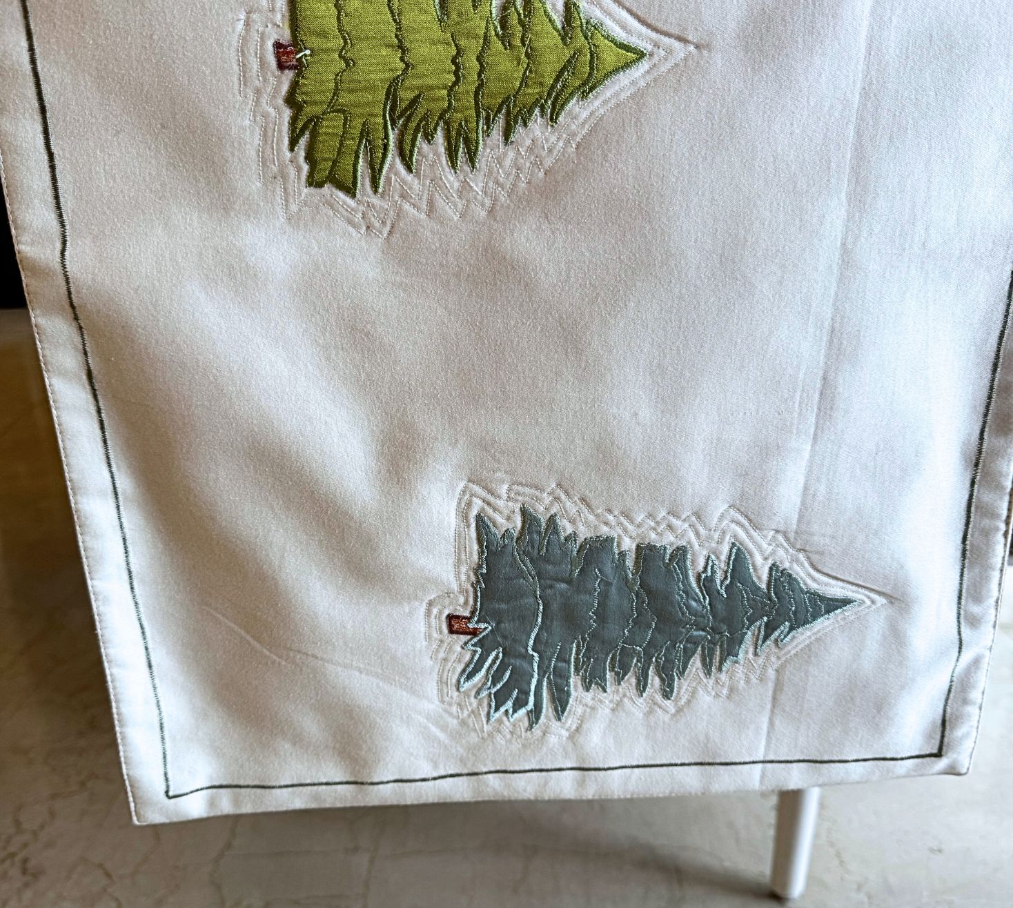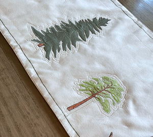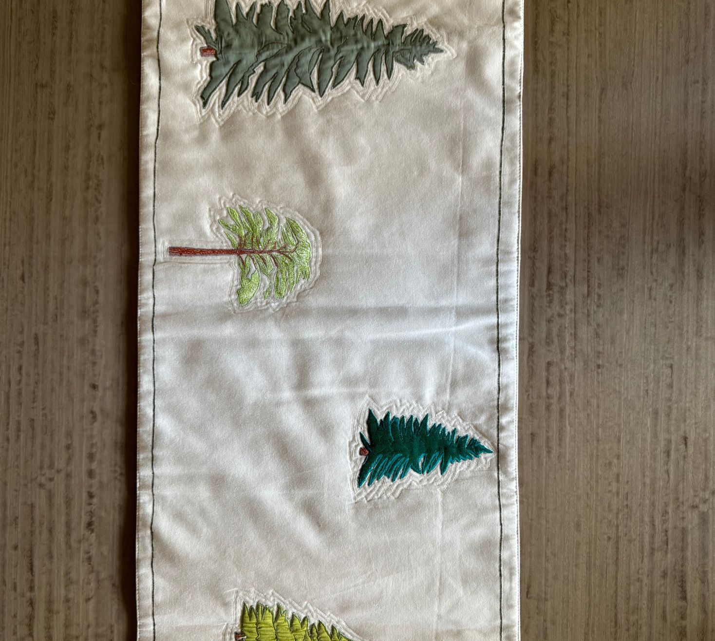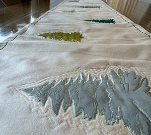 Our striking table runner features an artistic patchwork of trees, meticulously crafted in satin and cotton satin. Different shades of green intertwine, creating a rich, layered effect that brings nature’s vibrancy to life. Fresh, modern, and uniquely designed, it effortlessly blends organic charm with contemporary elegance. Perfect for adding a touch of refined artistry to any dining or console table. Hand crafted on off white cotton satin and appliqué work of various fabrics including, cottons, satins and dupions, the table runner adds a rich texture and a spring of life to an outdoor or an indoor place.