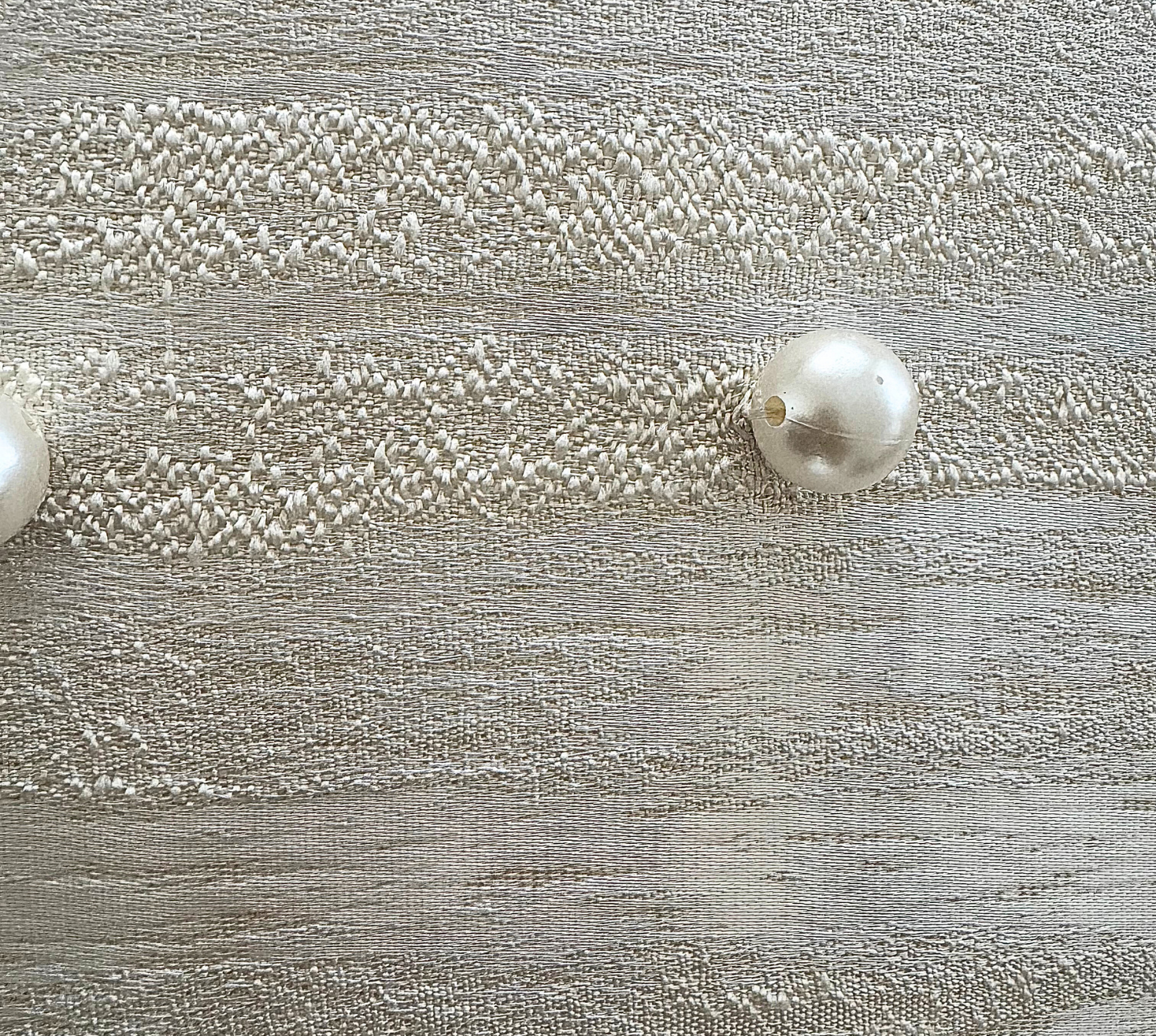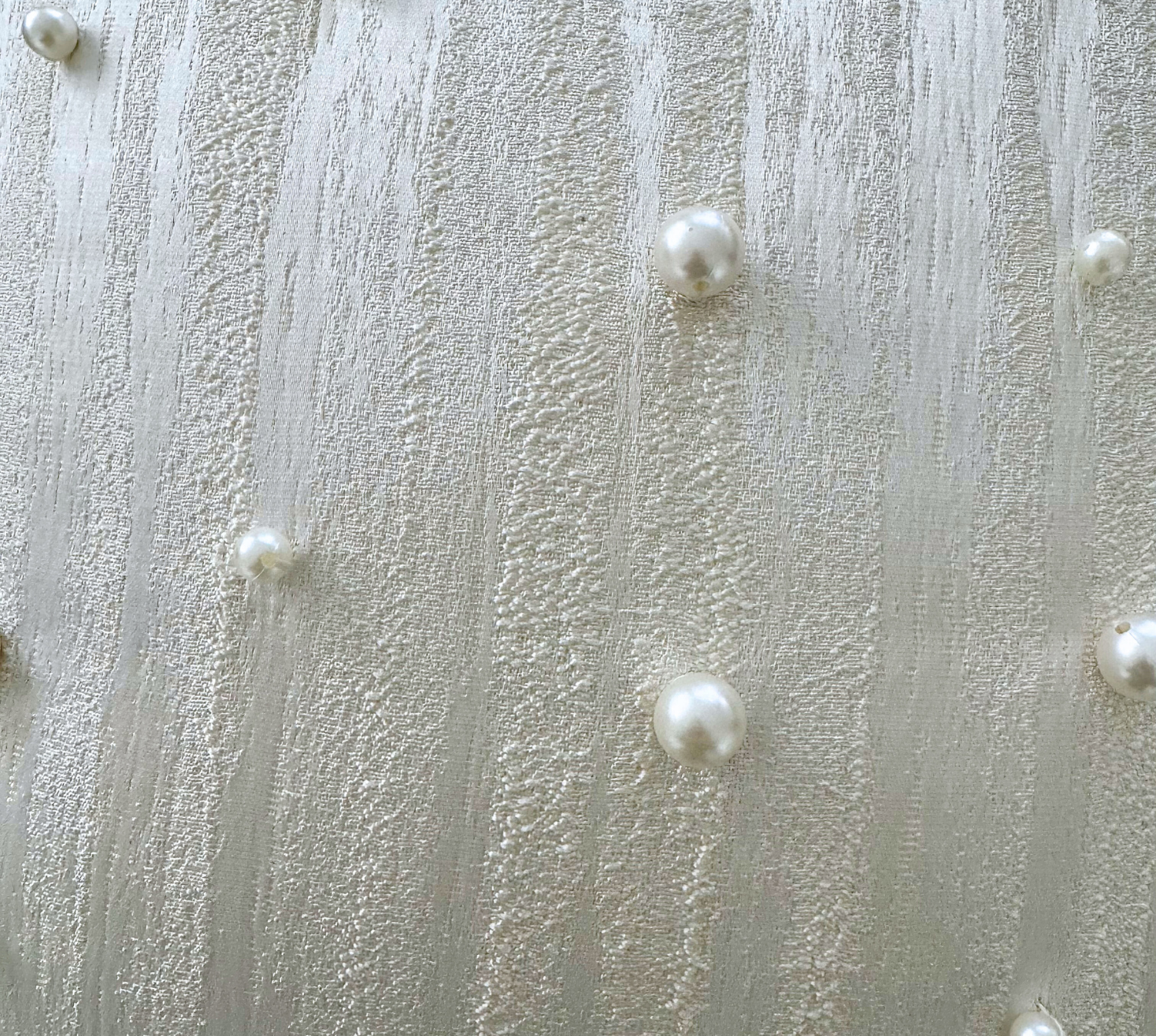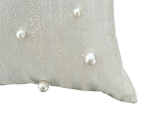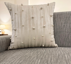 An off-white Jacquard cushion cover, adorned with small and large pearls stitched sparsely across its surface, exudes understated luxury. The softness of the fabric contrasts beautifully with the structured presence of the pearls, giving the piece both grace and strength. Each pearl catches the light, creating a subtle shimmer that enhances its delicate charm. Despite its refined elegance, this cushion holds a commanding presence, making it a statement of individuality. A perfect blend of softness and resilience, it is a testament to timeless craftsmanship and sophisticated design.