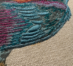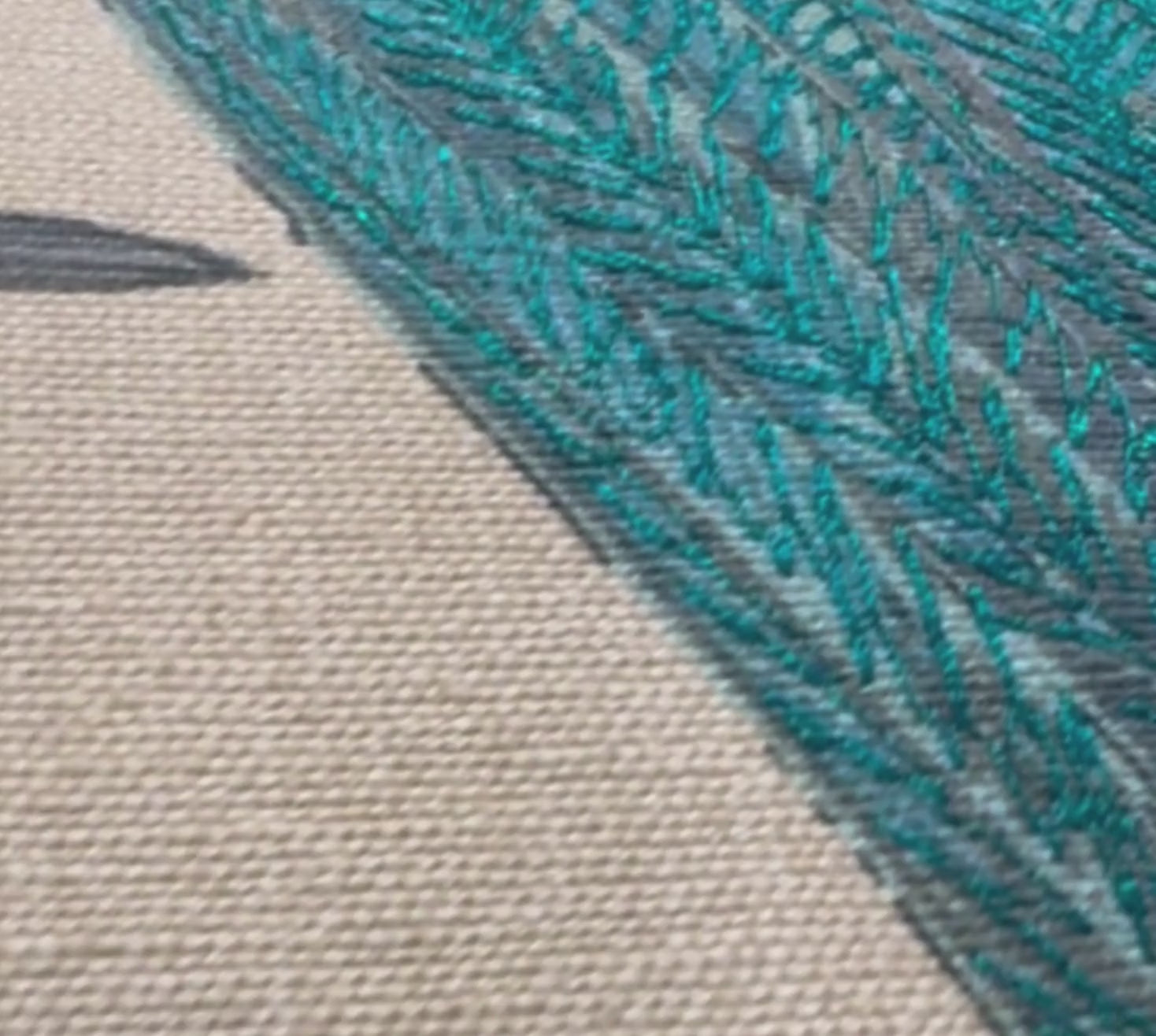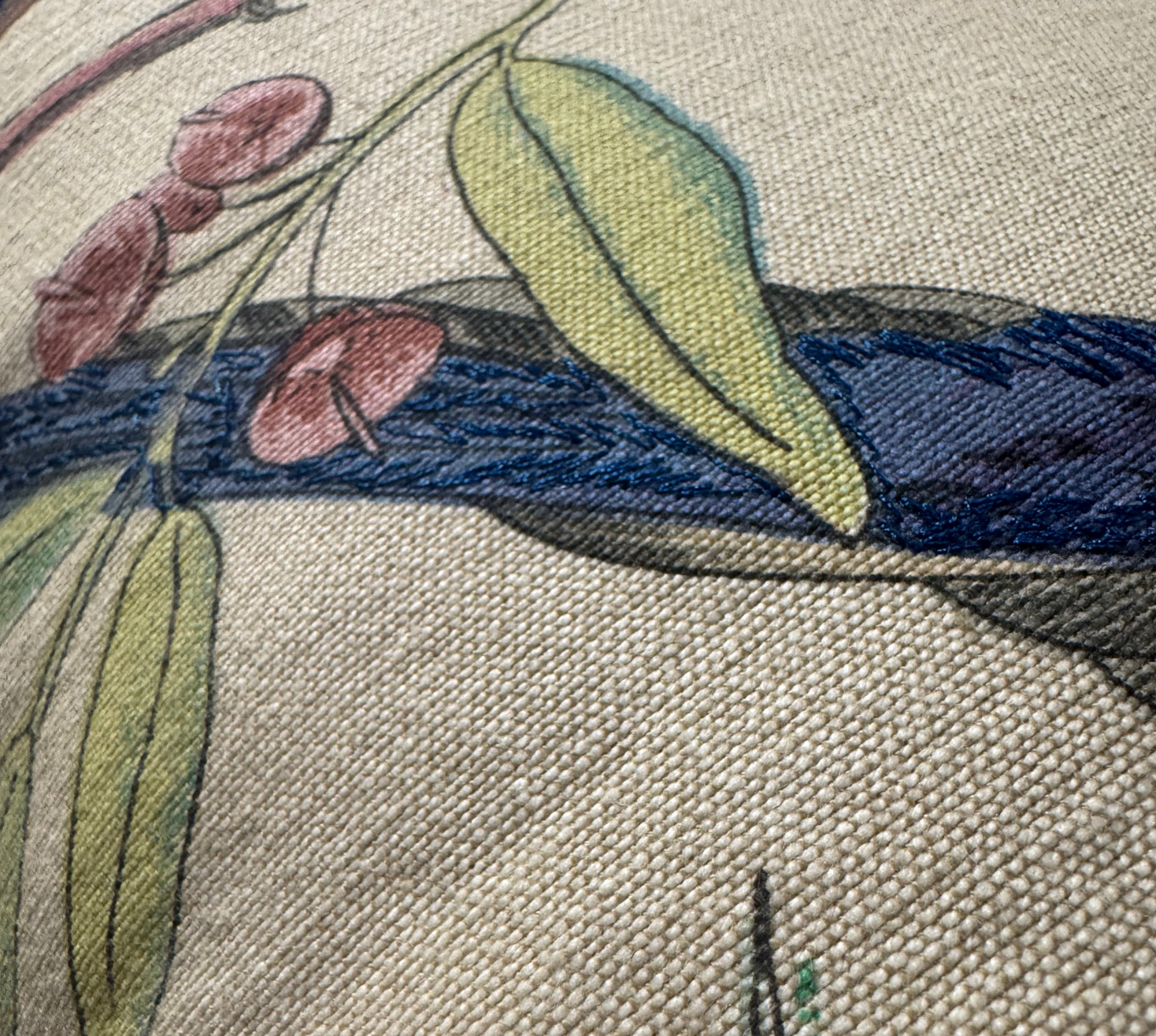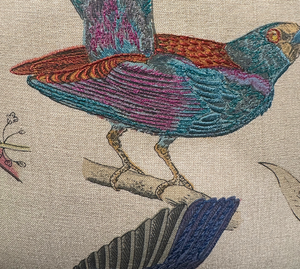 Printed on a jute linen base, this cushion showcases a playful display of birds, further elevated by intricate silk thread embroidery. The lively embellishments accentuate the printed motifs, creating a harmonious blend of texture and color. Vibrant hues of turquoise, greens, and purple burst across the design, infusing a chirpy and joyful spirit into the piece. Versatile in nature, it transitions seamlessly from outdoor settings to cozy indoor spaces. A delightful fusion of art and nature, this cushion is sure to energise any decor with its fun, spirited charm.