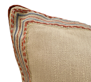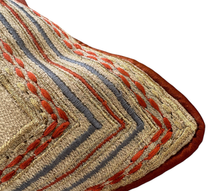 Our beautifully crafted cushion cover featuring 15 lines of intricate embroidery in various stitches and colours including rust, grey and gold is adorned on all four sides with artistic precision. Set against a beige cotton-linen base, the embroidery creates a stunning contrast, adding depth and texture. The design is framed with a rich rust piping, infusing a touch of vibrancy and warmth. A perfect blend of craftsmanship and elegance, this piece effortlessly enhances any space.