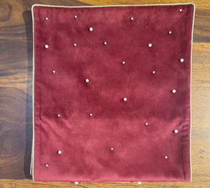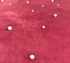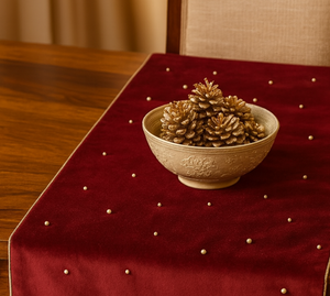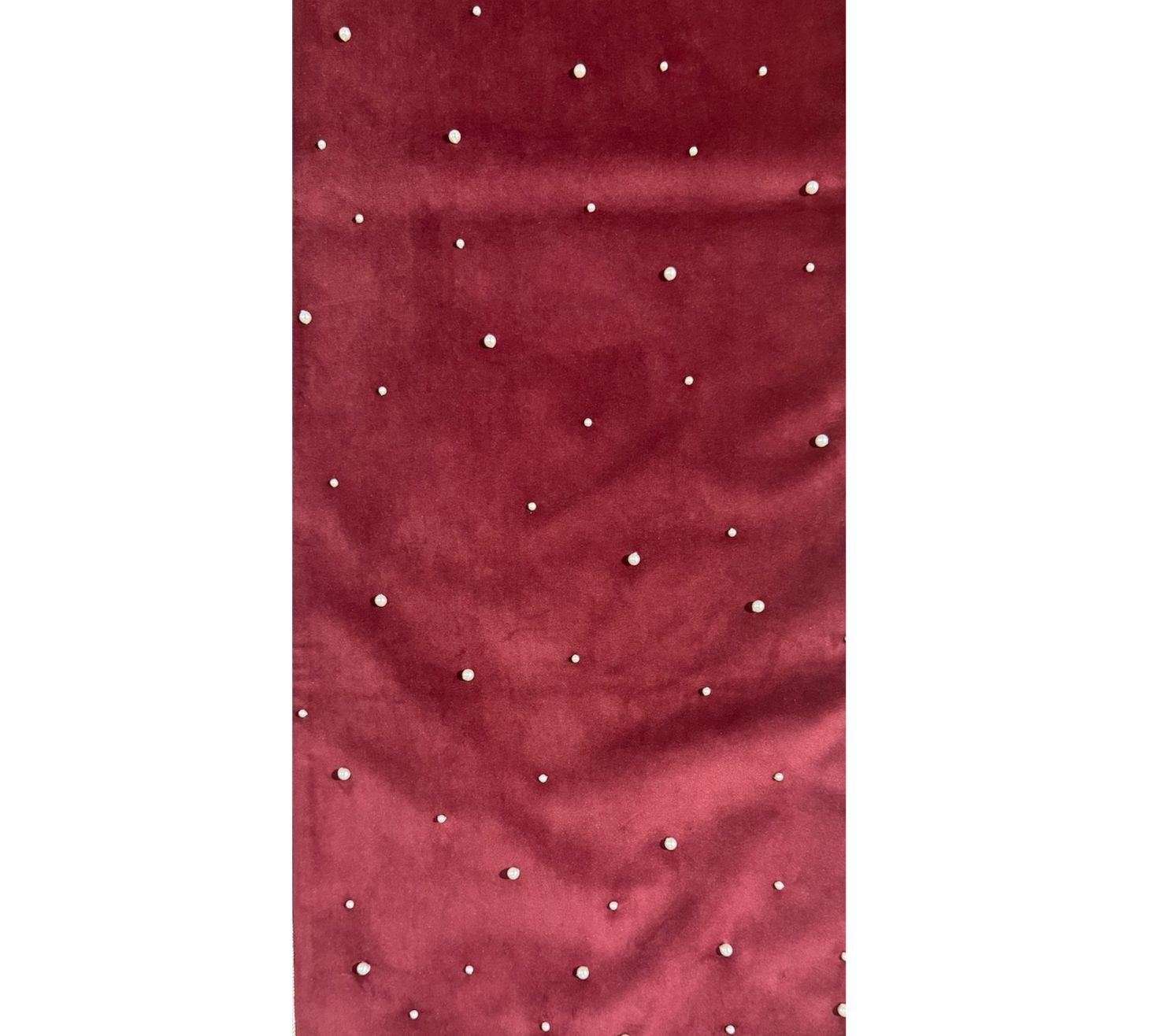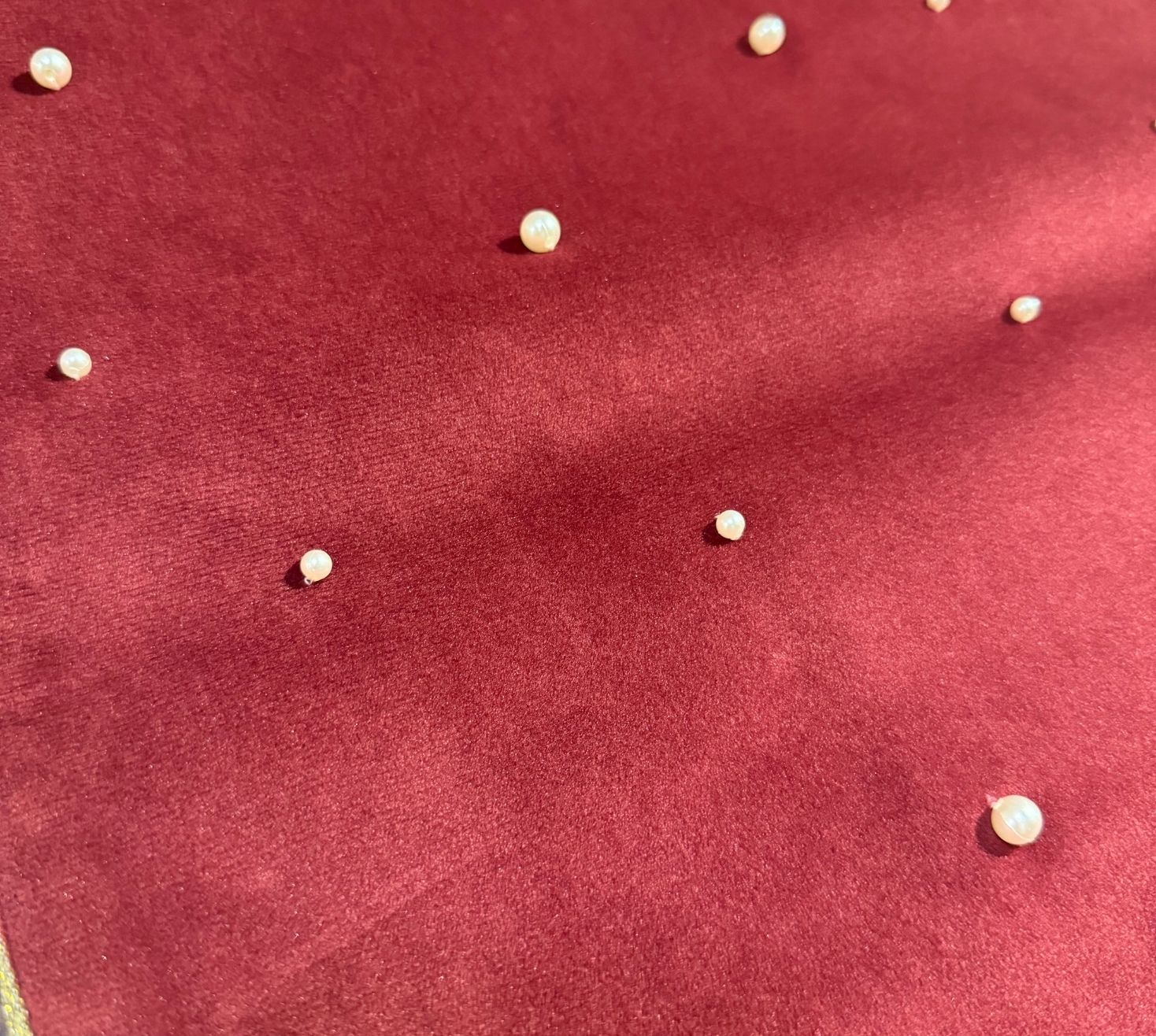 Our luxurious maroon velvet runner is adorned with white pearls delicately studded across its entire surface. The rich velvet adds warmth and depth, while the pearls bring a soft, luminous charm. Perfect for adding a regal touch to your table or décor, it blends opulence and is a true statement piece for any setting.