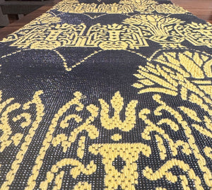 With a refined texture and sheen, this runner is crafted in a sleek steel-grey fabric that exudes understated luxury. Subtle yet striking, self-embroidery in a warm yellow hue creates a tonal pattern adding depth and dimension. The intricate self-textured design lends a sophisticated touch, making it a perfect blend of modern elegance and timeless craftsmanship.
