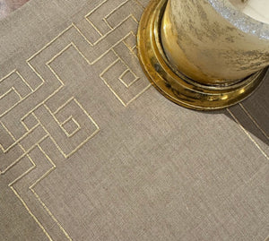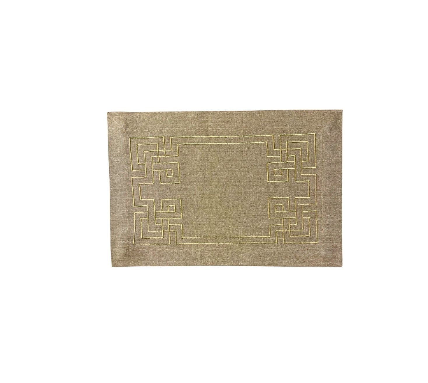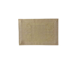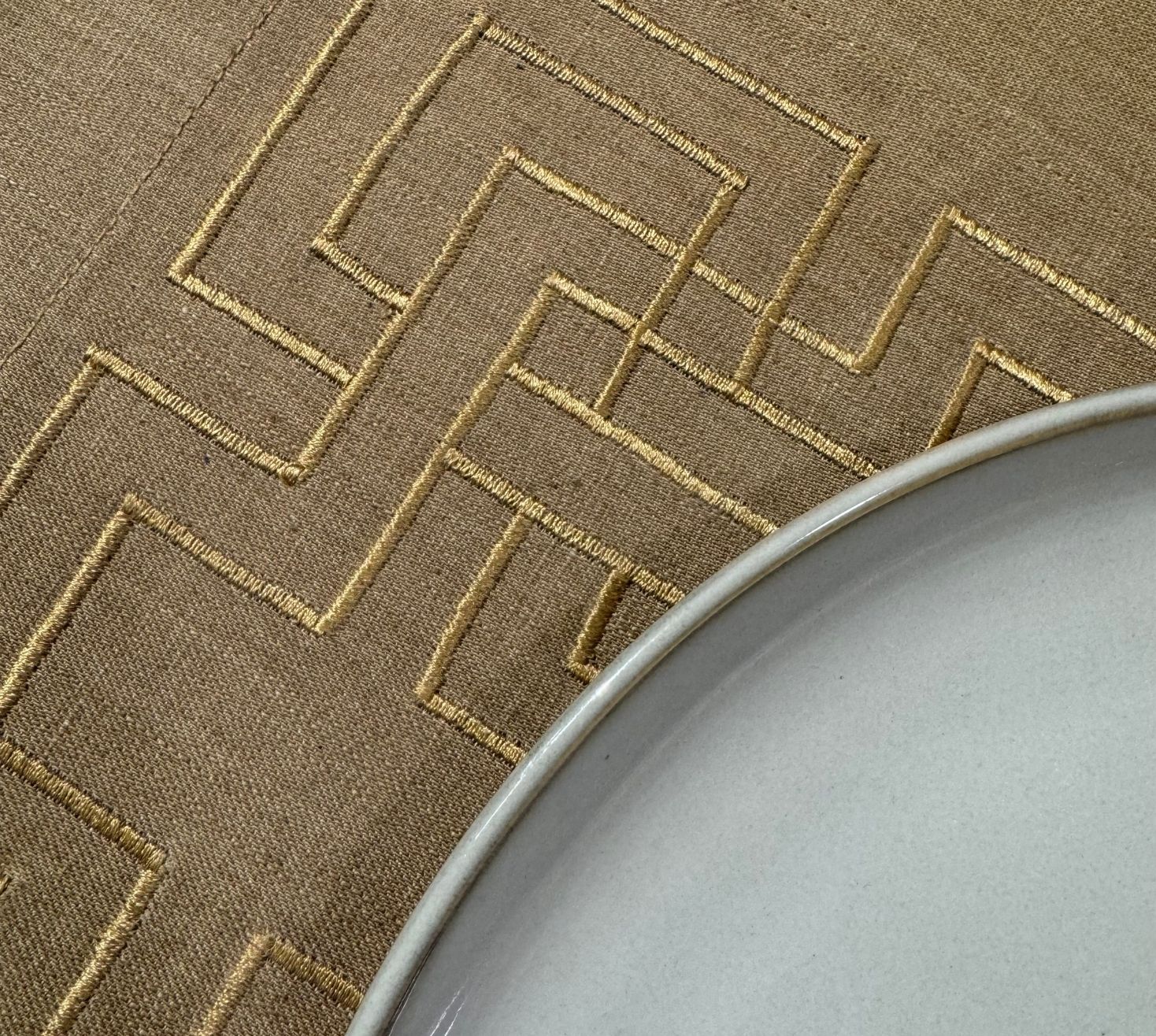 Crafted from fine linen, these placemats feature intricate resham thread embroidery on all four sides, showcasing a sophisticated geometric pattern. Perfect for adding an elegant touch to any table setting. Set of 6.