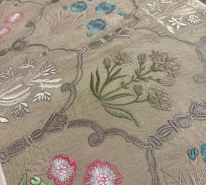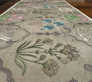Our brown respelendant silk runner exudes luxury. Hand. crafted with a blend of various silk threads, it features an intricate pattern of blooming flowers. The vibrant pattern of the floral design contrast beautifully with the rich brown backdrop, infusing a graceful charm and a cheerful burst of color into an otherwise formal setting. The traditional craftsmanship and contemporary design makes this runner a captivating centerpiece for any décor.