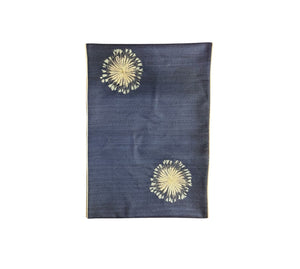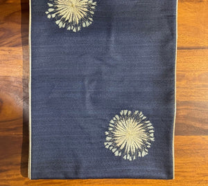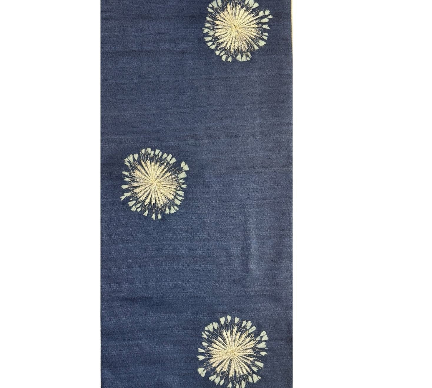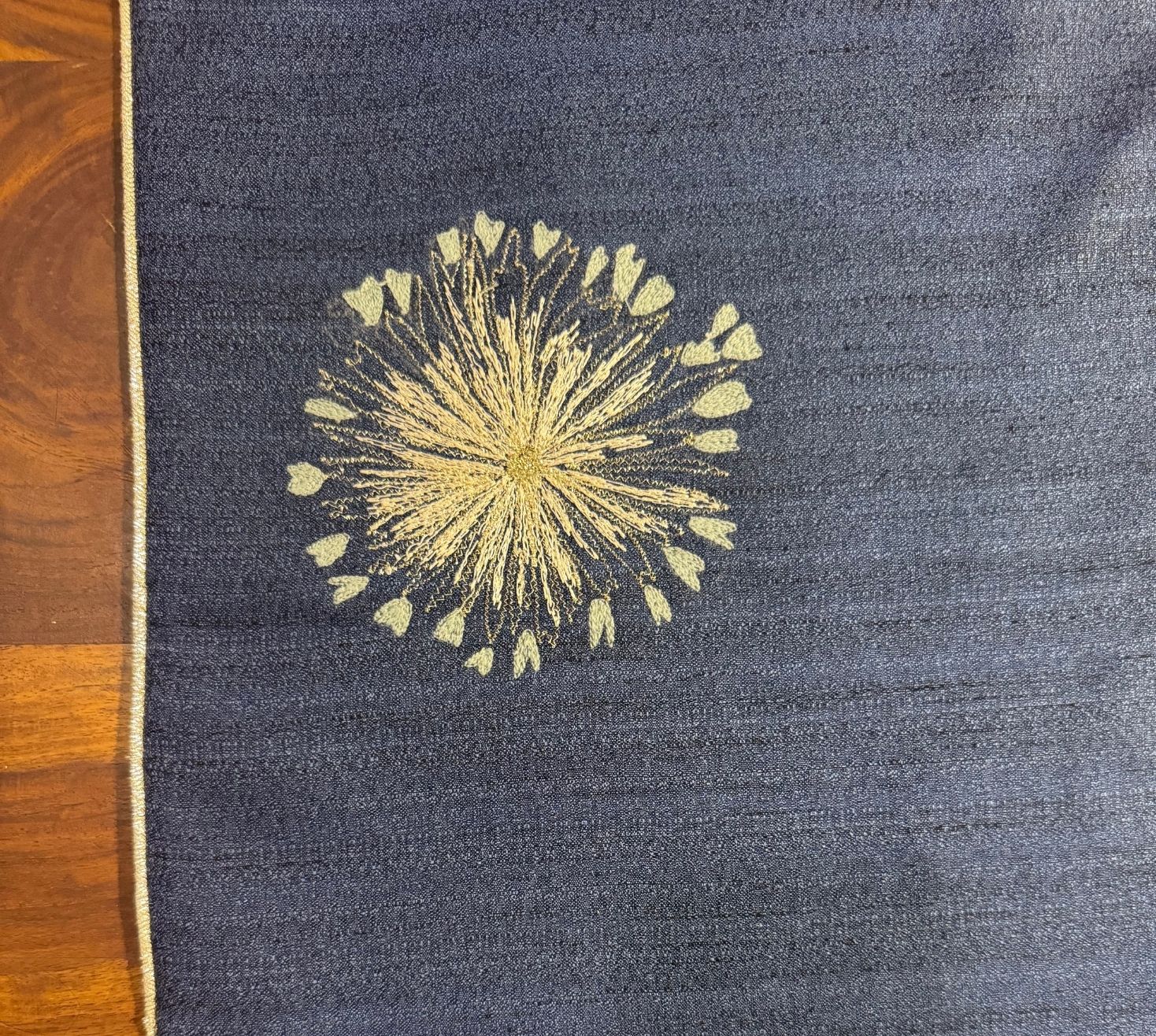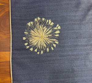 A deep ink-blue dupion runner comes alive with a vibrant burst of colors radiating from the centre, creating a striking embroidery. Delicately scattered across the expanse in sage, off-white, and beaten gold evokes a celestial constellation, lending an ethereal charm. The sparse yet intentional placement of the motifs enhances the sense of depth and elegance.