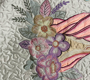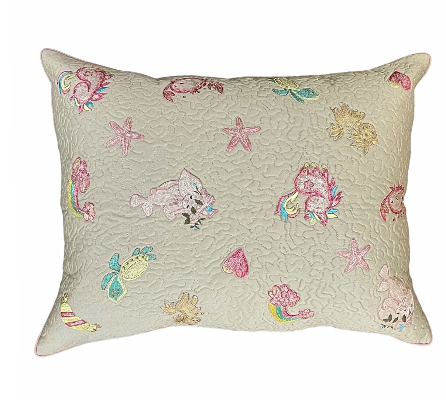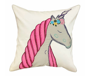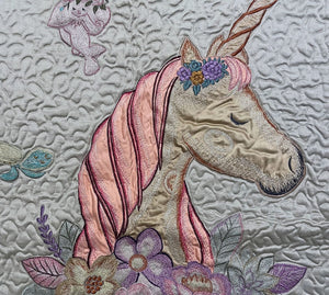 An imaginary world of unicorns leads us to an exceptional bed cover set revolving around the mythological animal resembling a horse. It comprises of a set of shams and cushions with a unicorn embroidered on one of its center cushions and in the center of the bedding. It's the creation of a heavenly body that has been translated into the form of beddings. It is cheerful, animated and quirky. The quilted bed cover is handcrafted in satin and is heavily embroidered all over.