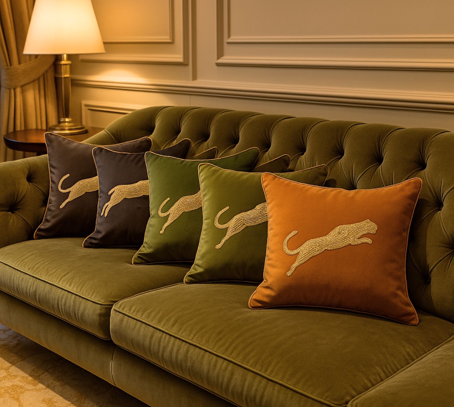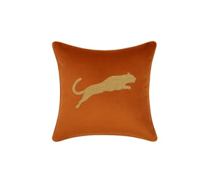 Each cushion is graced with a striking leaping leopard motif, an emblem of grace, power, and elegance expertly embroidered to catch the light and draw the eye.The velvet fabric offers an opulent texture and a smooth, lustrous finish, while the intricate zari work adds a golden glow that feels both traditional and contemporary. Sized at 16 x 16 inches, these cushions strike the perfect balance between style and comfort, making them versatile accents for sofas, armchairs, or beds.