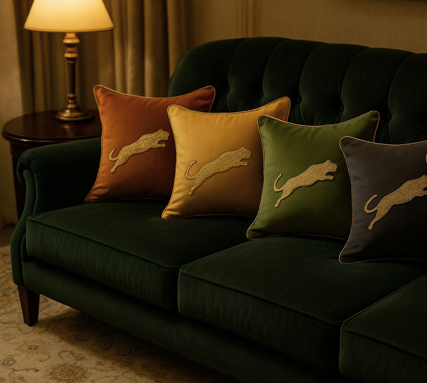 Each cushion is graced with a striking leaping leopard motif, an emblem of grace, power, and elegance expertly embroidered to catch the light and draw the eye.The velvet fabric offers an opulent texture and a smooth, lustrous finish, while the intricate zari work adds a golden glow that feels both traditional and contemporary. Sized at 16 x 16 inches, these cushions strike the perfect balance between style and comfort, making them versatile accents for sofas, armchairs, or beds.