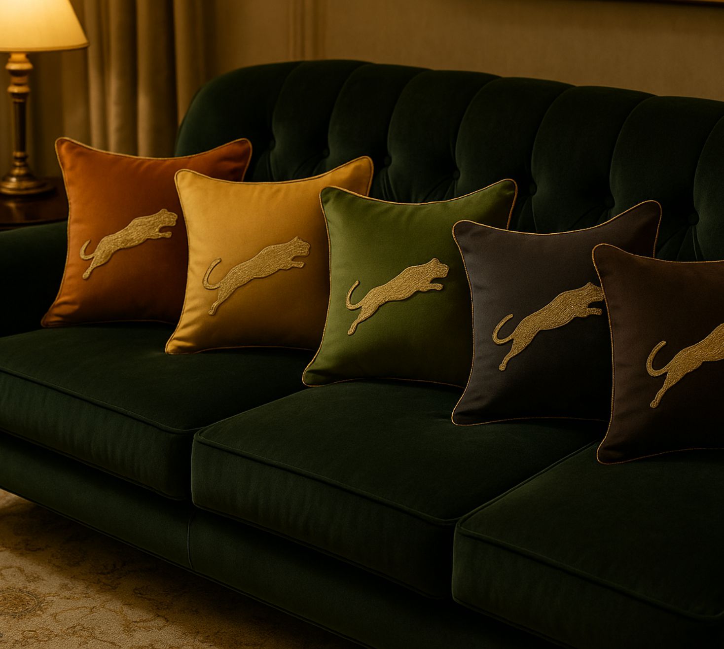 Each cushion is graced with a striking leaping leopard motif, an emblem of grace, power, and elegance expertly embroidered to catch the light and draw the eye.The velvet fabric offers an opulent texture and a smooth, lustrous finish, while the intricate zari work adds a golden glow that feels both traditional and contemporary. Sized at 16 x 16 inches, these cushions strike the perfect balance between style and comfort, making them versatile accents for sofas, armchairs, or beds.