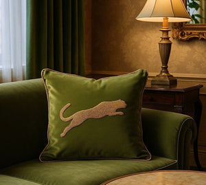 Each cushion is graced with a striking leaping leopard motif, an emblem of grace, power, and elegance expertly embroidered to catch the light and draw the eye.The velvet fabric offers an opulent texture and a smooth, lustrous finish, while the intricate zari work adds a golden glow that feels both traditional and contemporary. Sized at 16 x 16 inches, these cushions strike the perfect balance between style and comfort, making them versatile accents for sofas, armchairs, or beds.