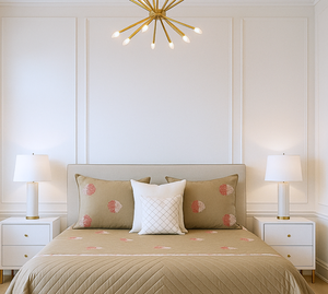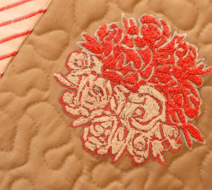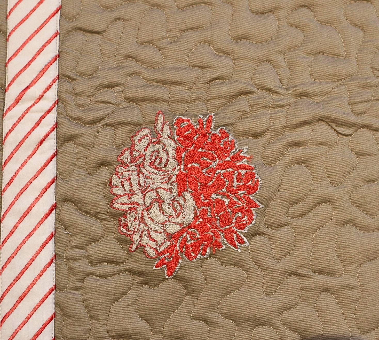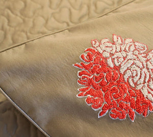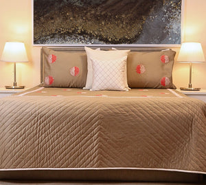 This exquisite quilted bed cover in soft brown exudes timeless elegance, featuring delicate rose embroidery in a harmonious blend of white and peach cotton dori. The intricate handwork adds a layer of sophistication, with every stitch meticulously placed to create a rich, textured design. The roses, with their graceful petals and gentle curves, come to life against the serene backdrop of the brown quilt, making it a perfect fusion of warmth and beauty. Accompanying the cover are matching embroidered shams and centerpieces, each thoughtfully designed to complement the main quilt. The entire ensemble showcases luxurious craftsmanship, with every element being a testament to refined artistry and attention to detail.