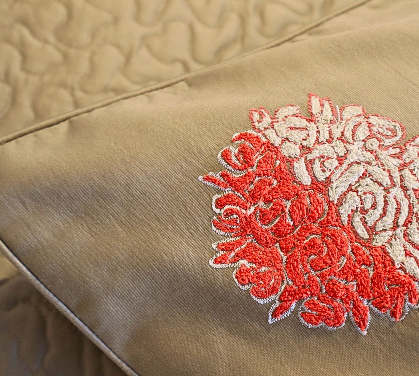 Elevate your bedroom style with this luxury bedding featuring an embroidered set of shams and cushions.